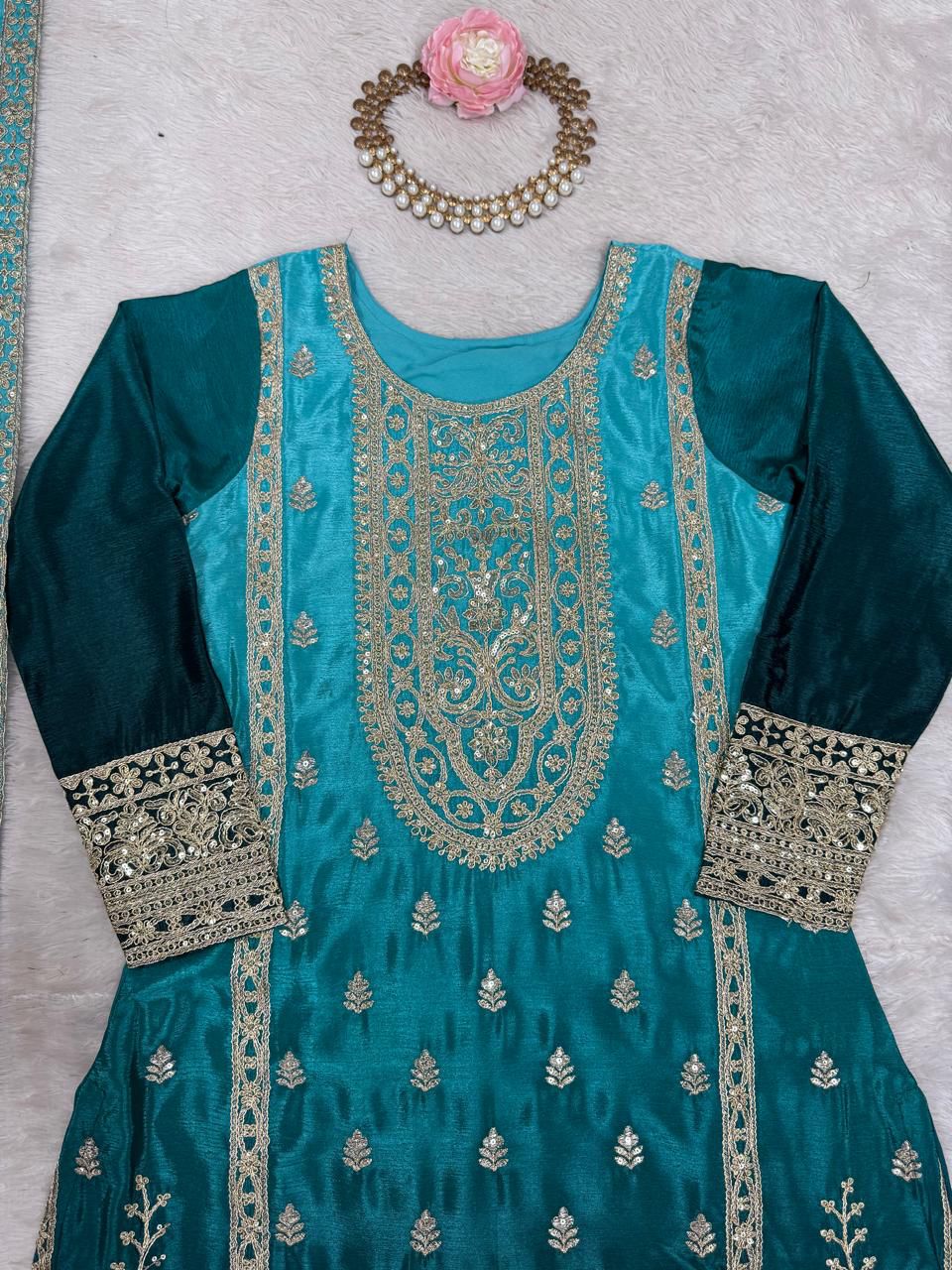 The Elegance of Aqua Color Chinon Silk Fabric Sequence Work Palazzo Suit