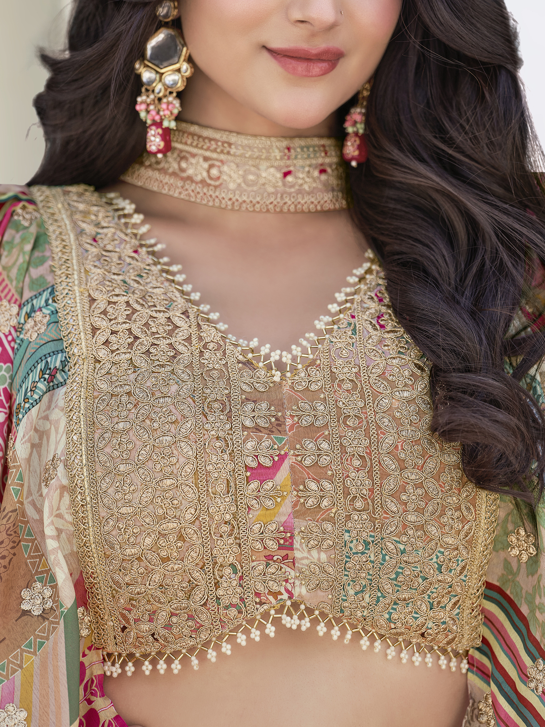 Beige Color Chinon Silk Fabric Digital Print Embroidery Work Lehenga