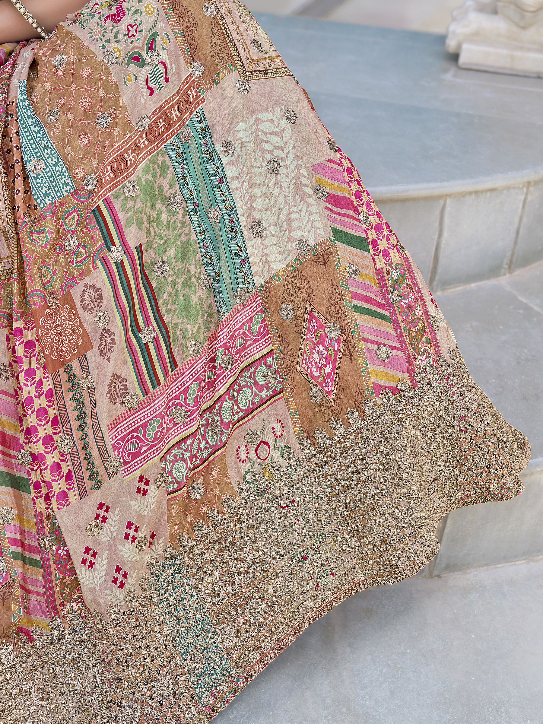 The Allure of Beige Color Chinon Silk Fabric Lehengas: A Perfect Blend of Digital Print and Embroidery
