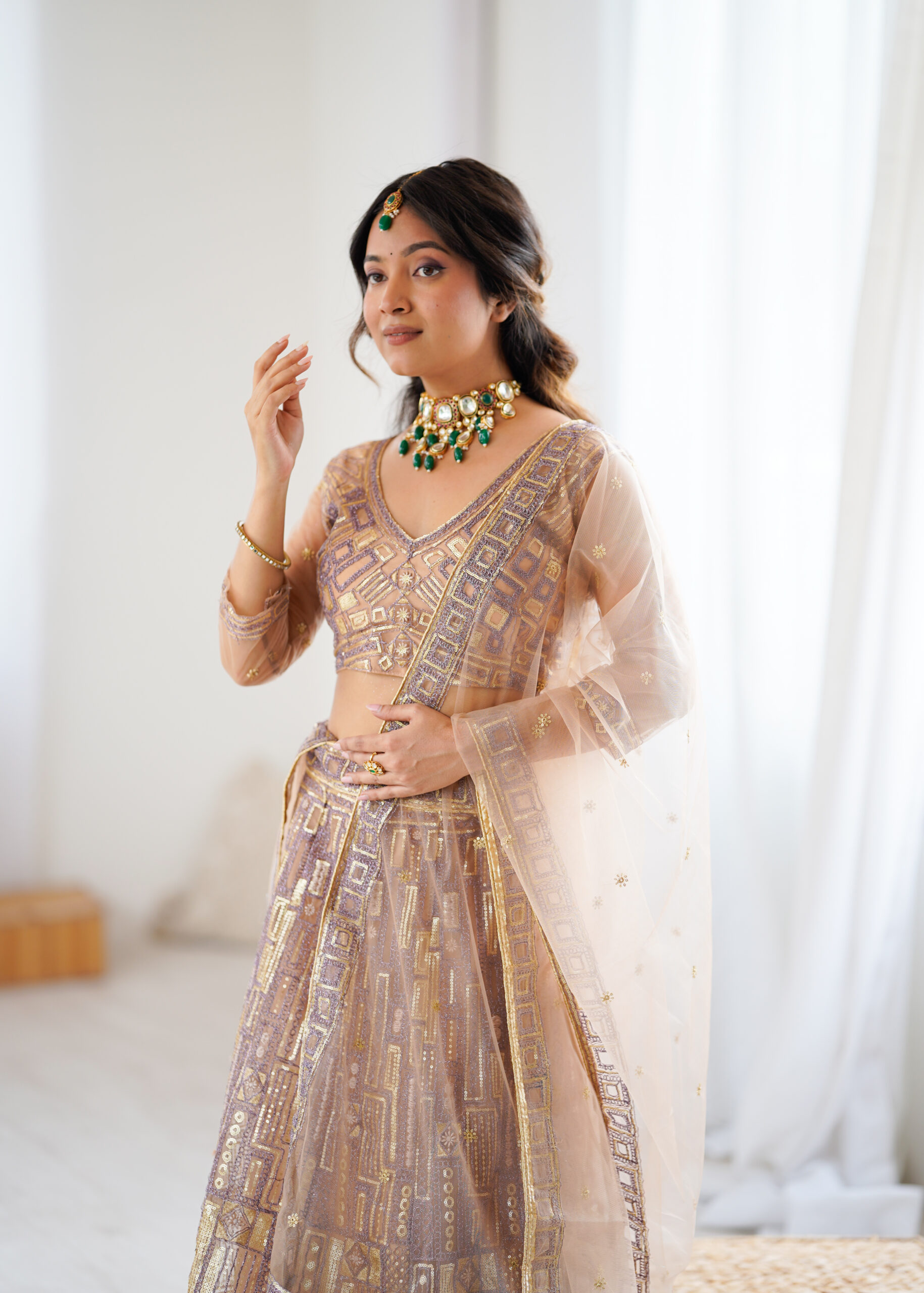 When styling a lehenga made from soft butterfly net fabric, consider complementing it with matching jewelry and accessories. Silver or gold tones can beautifully contrast with the Beige shade, amplifying your overall appearance. Additionally, light make-up with soft hues can enhance the elegance of your outfit. Remember, the goal is to let your lehenga take center stage while you radiate grace and sophistication.
