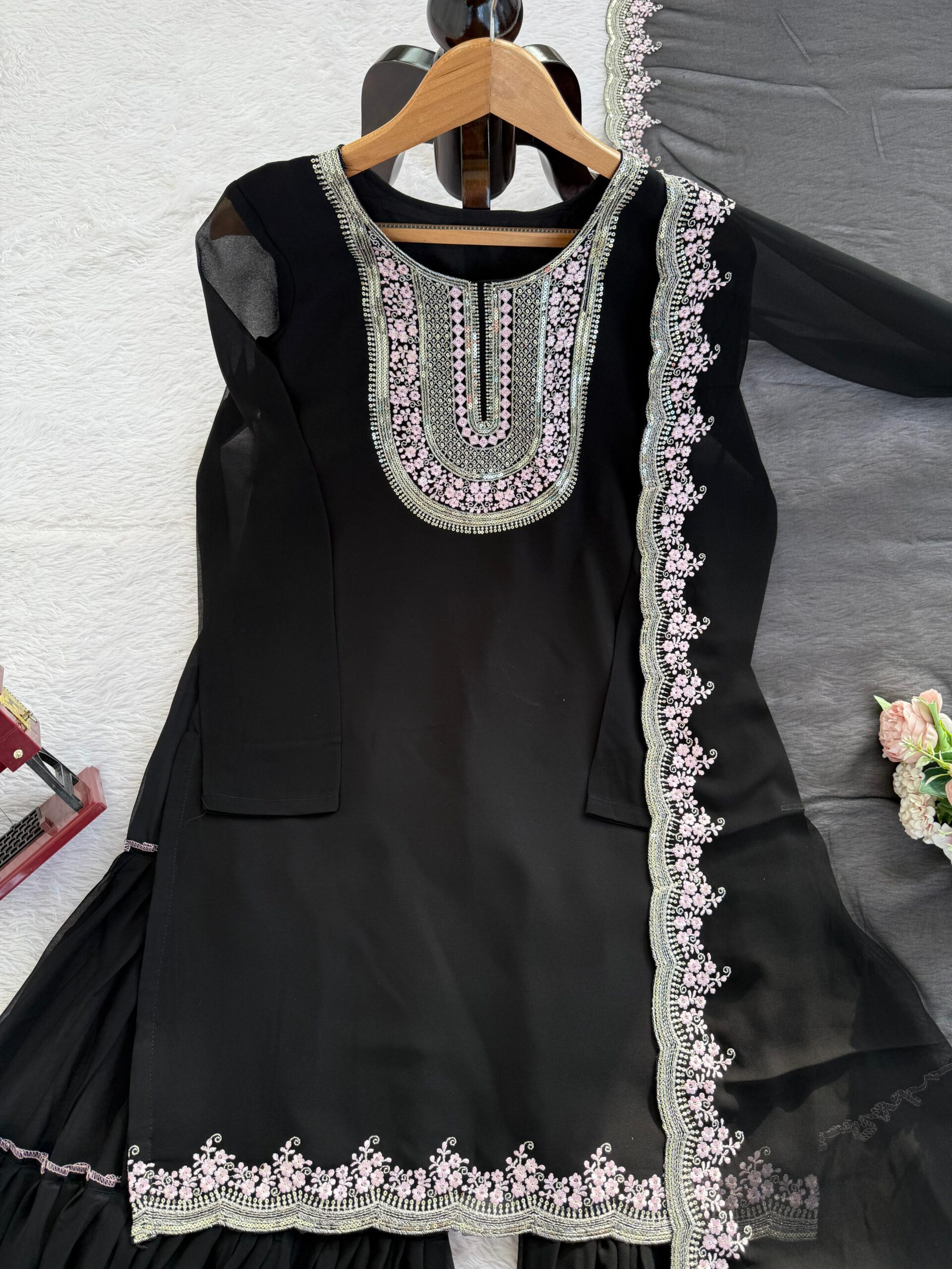Elevate Your Wardrobe with a Black Color Faux Georgette Fabric Thread Sharara Set