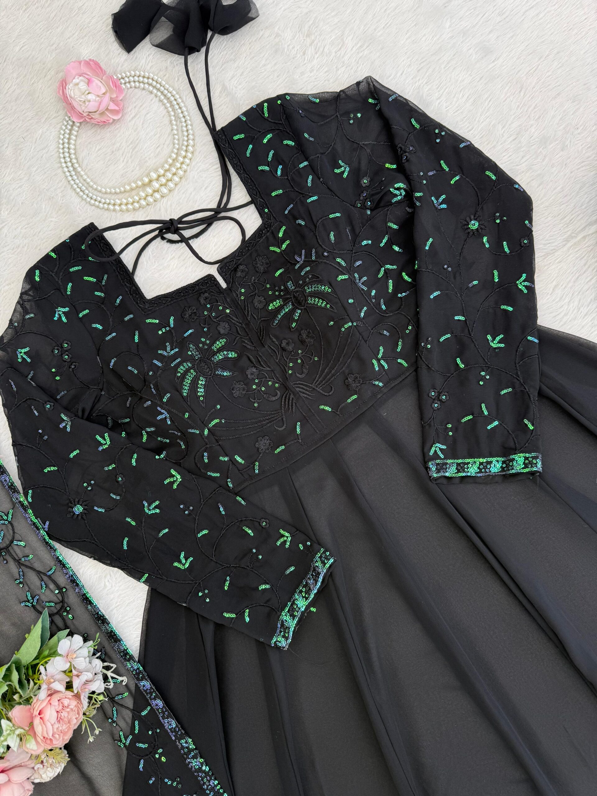 Be the first to review “Black Color Faux Georgette Fabric Thread With Sequence Work Palazzo Suit”