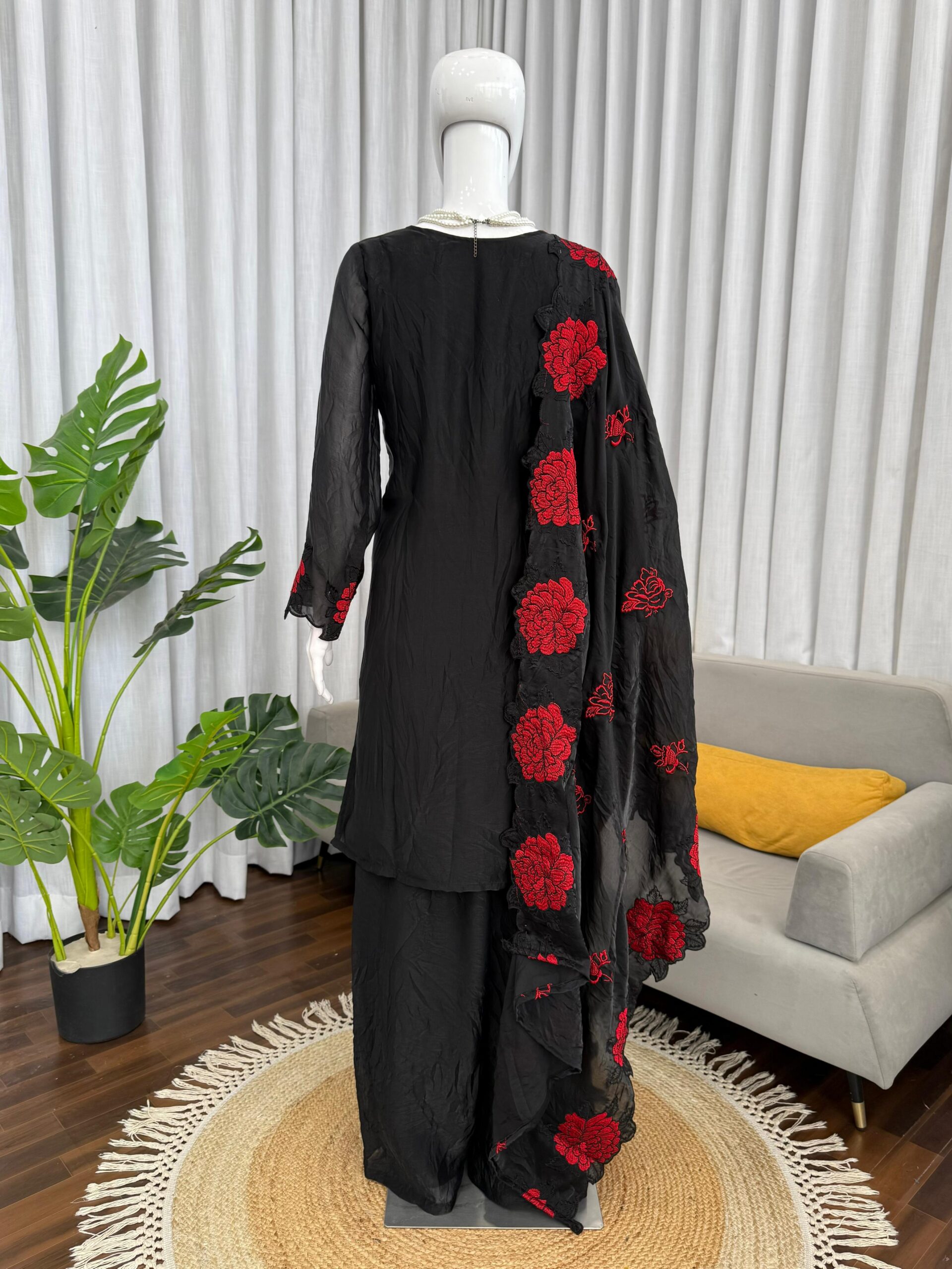 Stylish Black Color Fendi Silk Fabric Thread Work Palazzo Suit