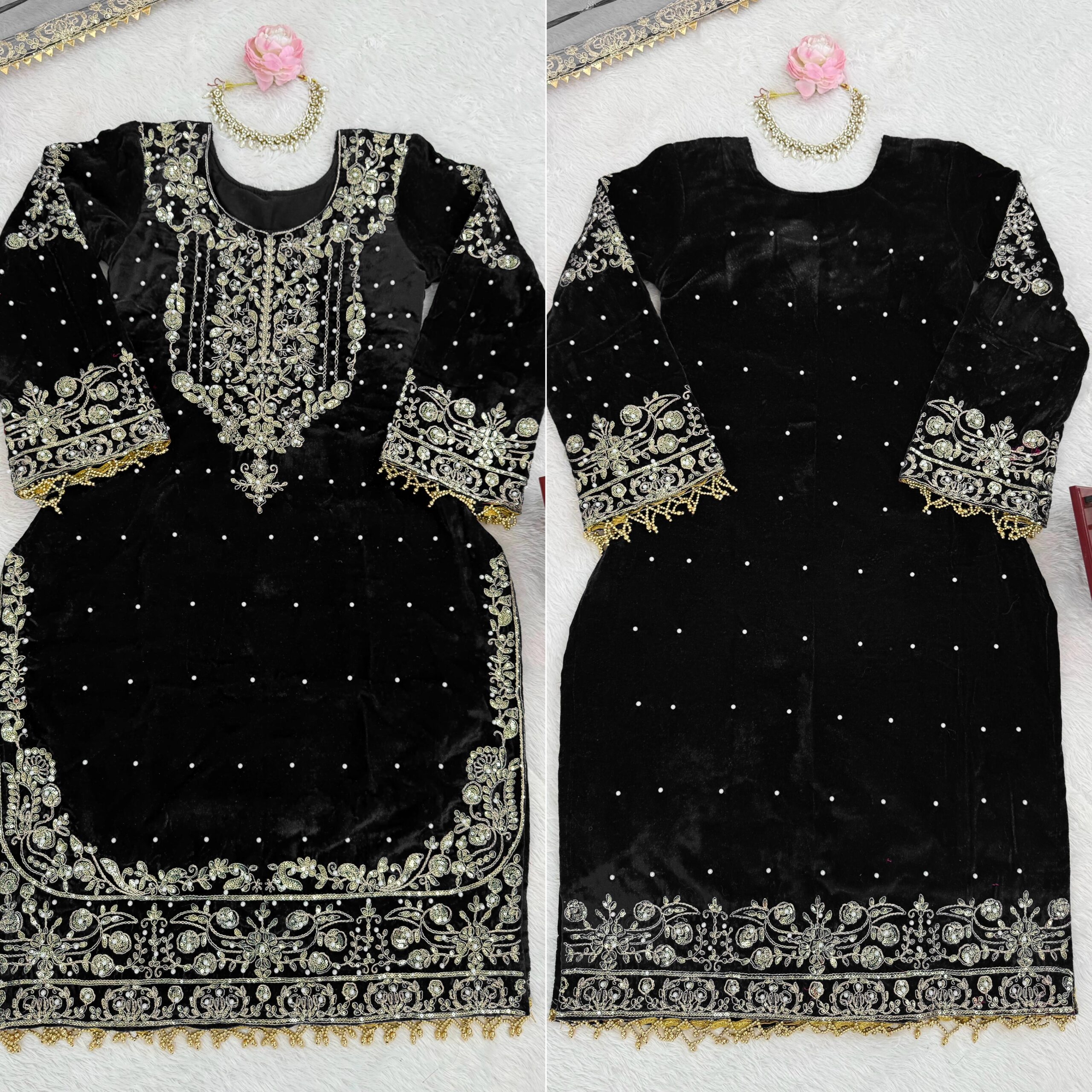 The versatility of a Black color viscose velvet fabric Sequence Work With Pearl Work Sharara Suit makes it perfect for various occasions. Pair it with subtle accessories for a sophisticated evening look. Or, wear it with trendy footwear for a more casual outing.