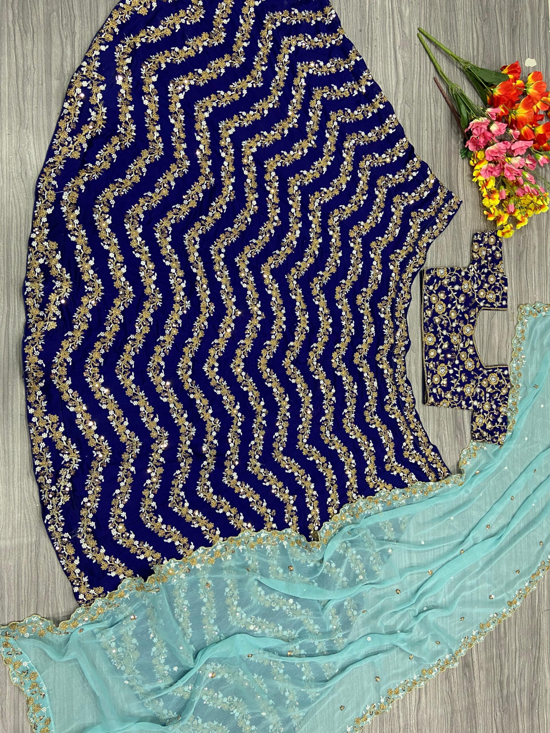 To create an eye-catching ensemble, pair your Blue chinon silk lehenga with complementing accessories. Gold or silver jewelry works wonderfully, enhancing the sequined details without overwhelming the delicate fabric.