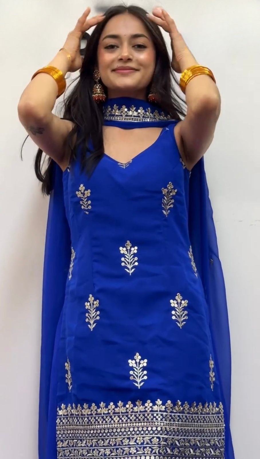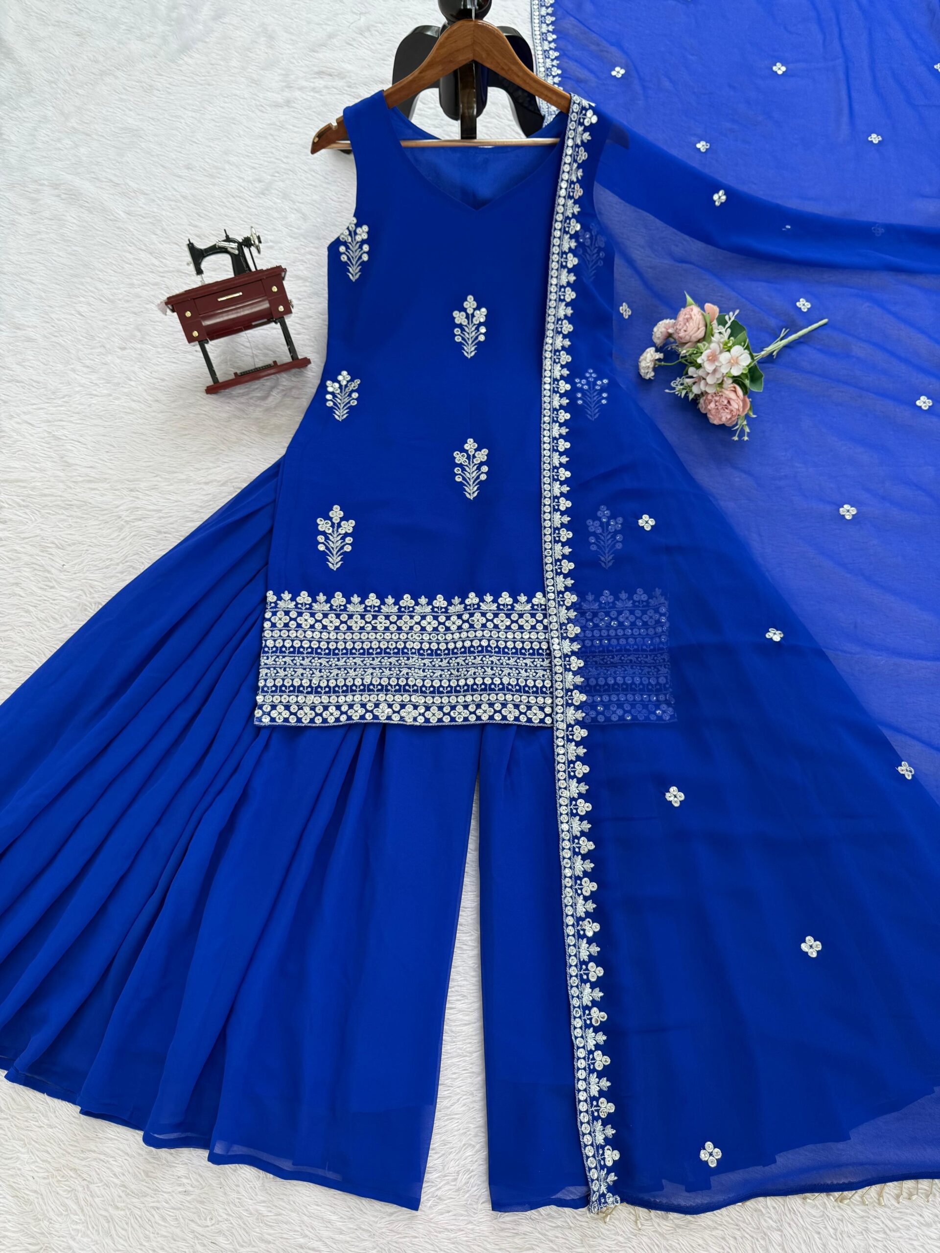 Whether you’re attending a wedding reception, a festive celebration, or a casual gathering, this ensemble is sure to make heads turn, particularly when featuring the renowned Blue Faux Georgette Palazzo Set.