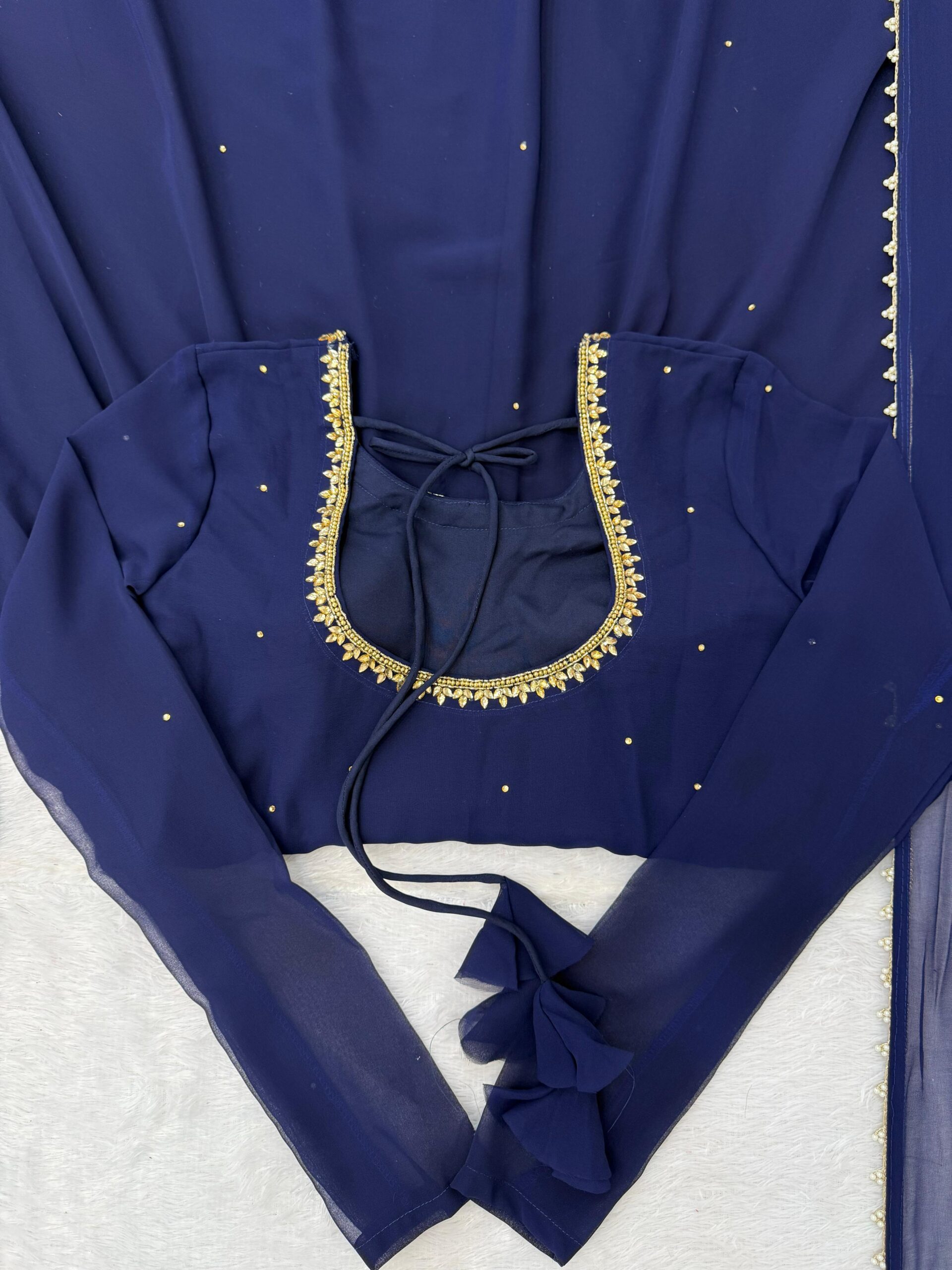 This gown is not just a piece of clothing; it’s a statement of style and glamour. Whether you attend a special event or celebrate a significant milestone, a Blue color faux georgette fabric stone work gown will undoubtedly make you feel special and look fabulous!