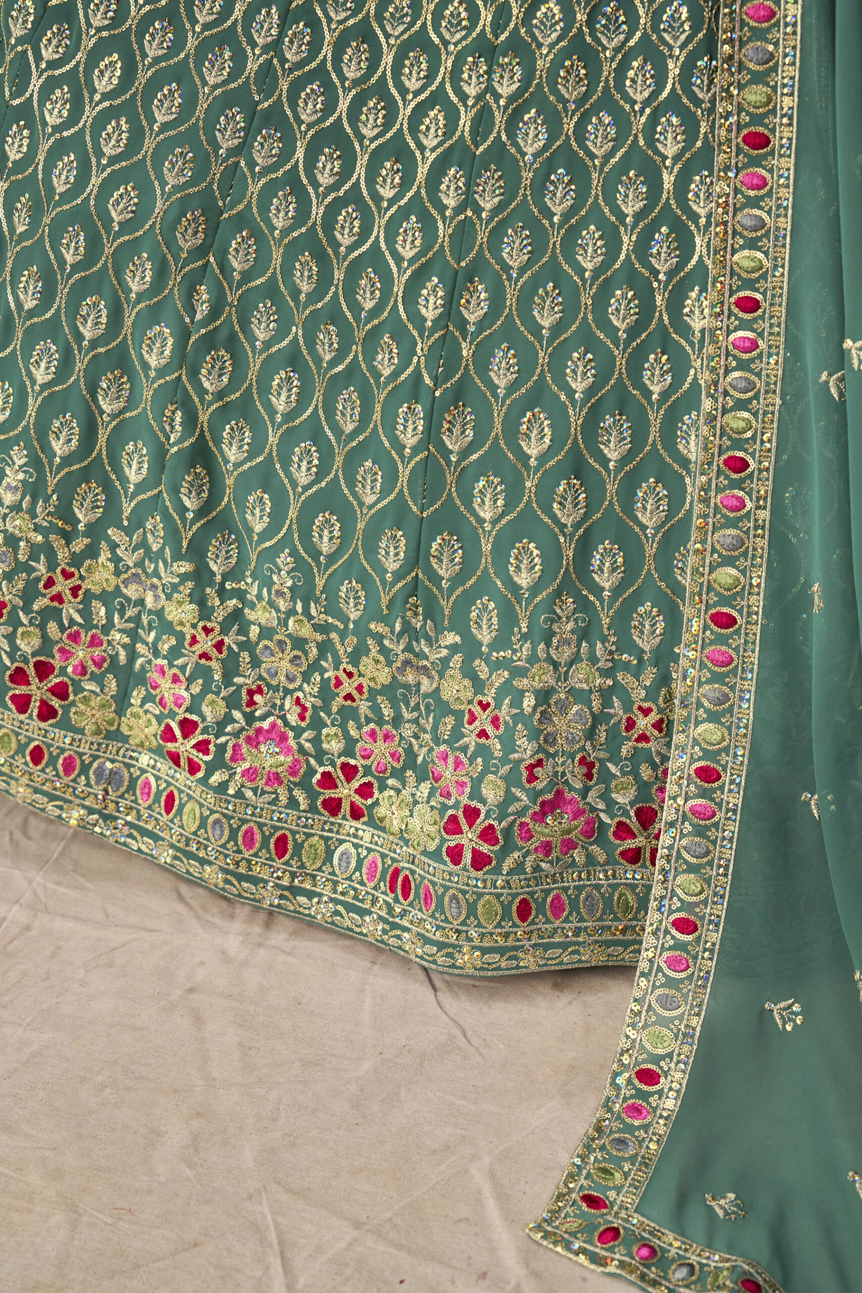 The highlight of the blue georgette lehenga is undoubtedly the exquisite sequence embroidery work. This intricate detailing adds a touch of glamour and sophistication, elevating the overall aesthetic of the outfit. Sequence work reflects light beautifully, creating a dazzling effect that enhances your look, especially in evening settings.