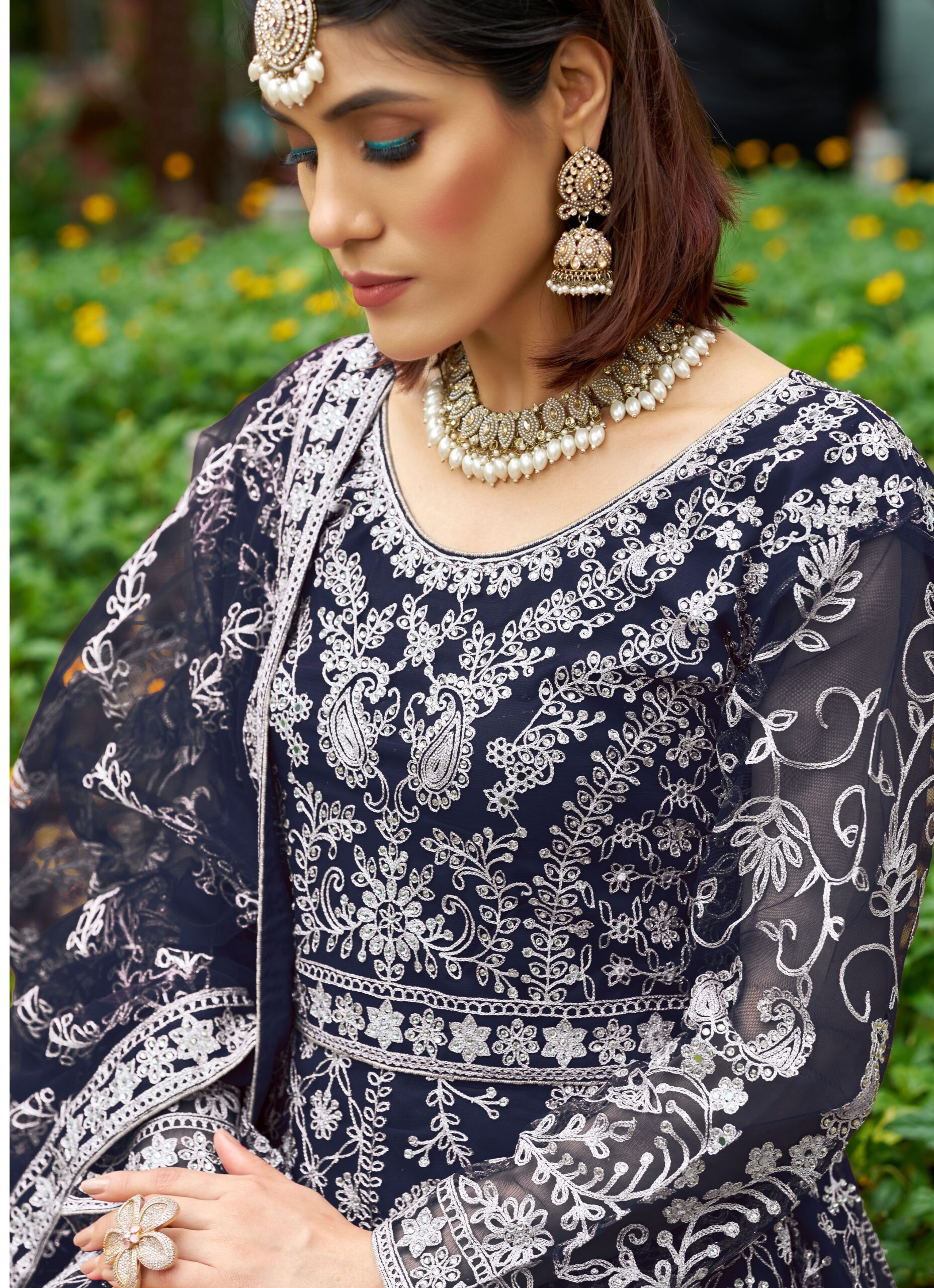 Heavy embroidery work on Blue color pure butterfly net fabric transforms simple outfits into opulent creations. The intricate designs often feature floral motifs, geometric patterns, or traditional embroidery techniques. These reflect rich cultural heritage, emphasized in a Blue Net Fabric Suit.