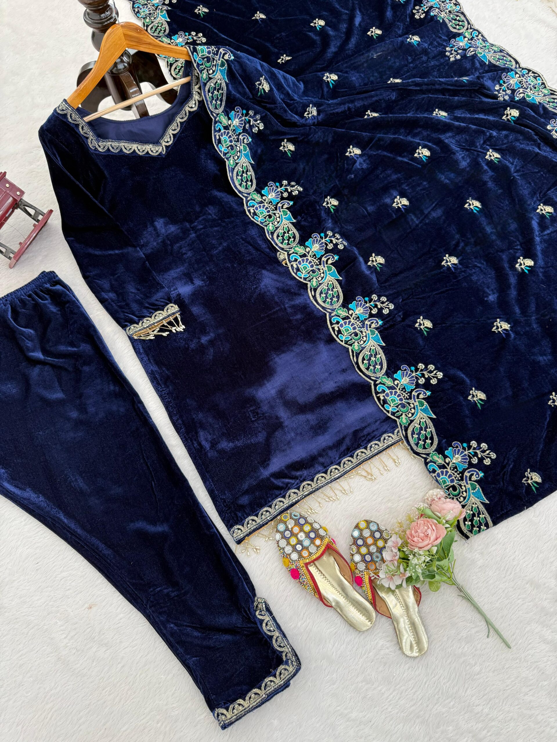 To maintain the luxurious feel and appearance of your blue color viscose velvet fabric sequence work suit, proper care is essential. Hand washing is recommended, using mild detergent. Avoid wringing the fabric to prevent damage and, instead, gently press the water out. Keep your Viscose Velvet Outfit away from direct sunlight to prevent fading, ensuring it remains a timeless piece in your wardrobe.