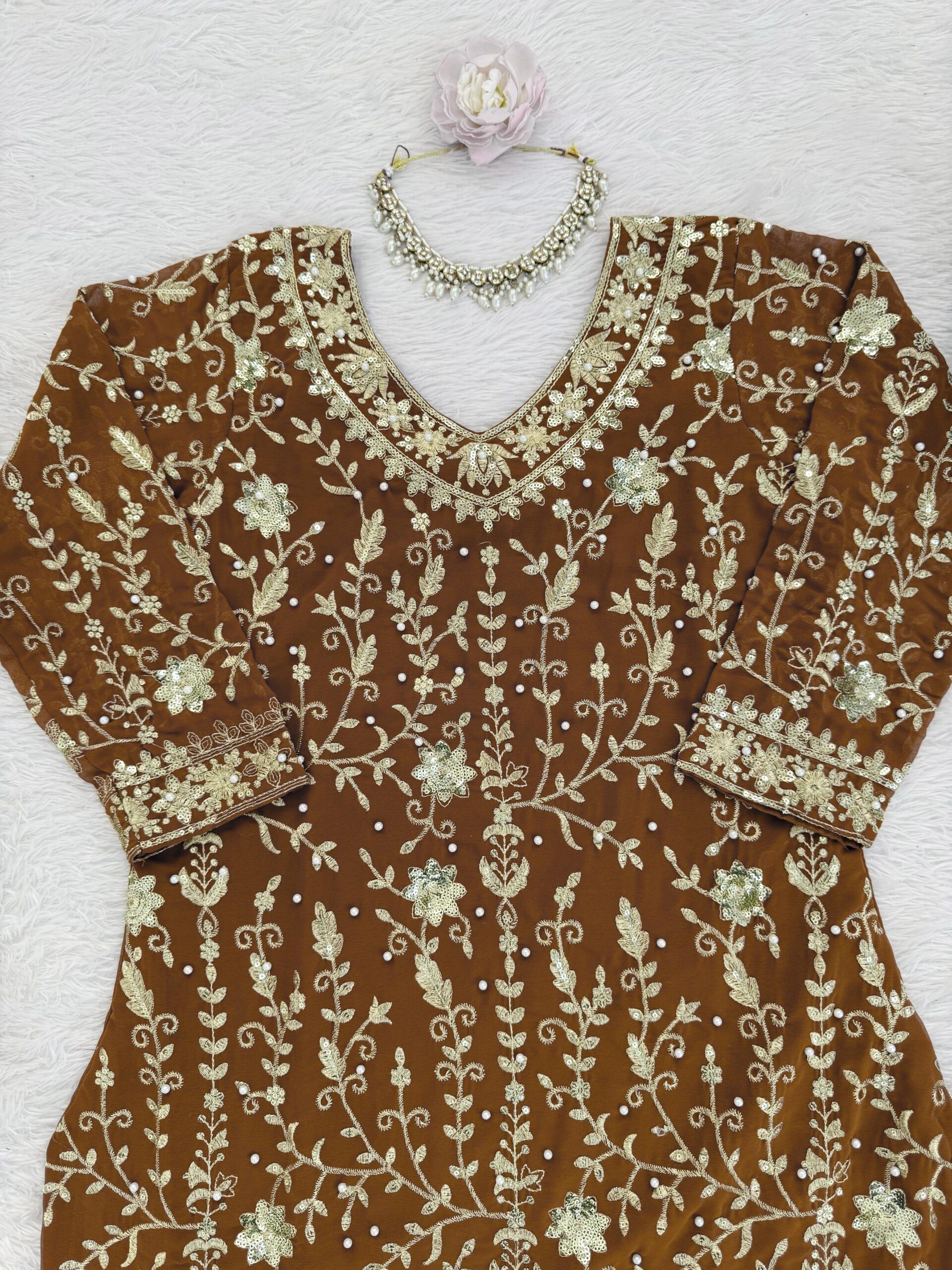 The sharara set has long been a staple in traditional attire, known for its comfortable yet elegant style. Among various options available, a Brown color faux georgette fabric thread with sequence work And Pearl Work sharara set stands out. With its vibrant hue and intricate detailing, this outfit perfectly balances modern fashion trends with classic elements.