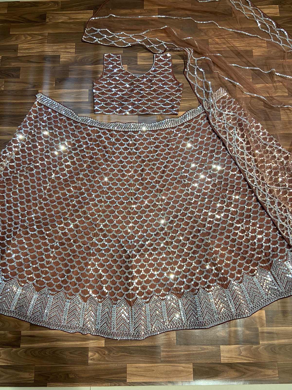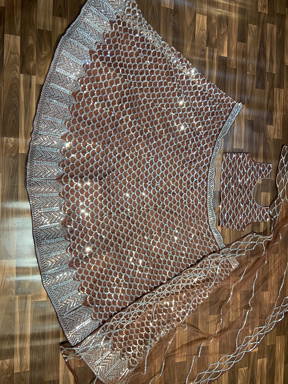 Elevate Your Wardrobe with Brown Color Net Fabric Sequence Work Lehenga