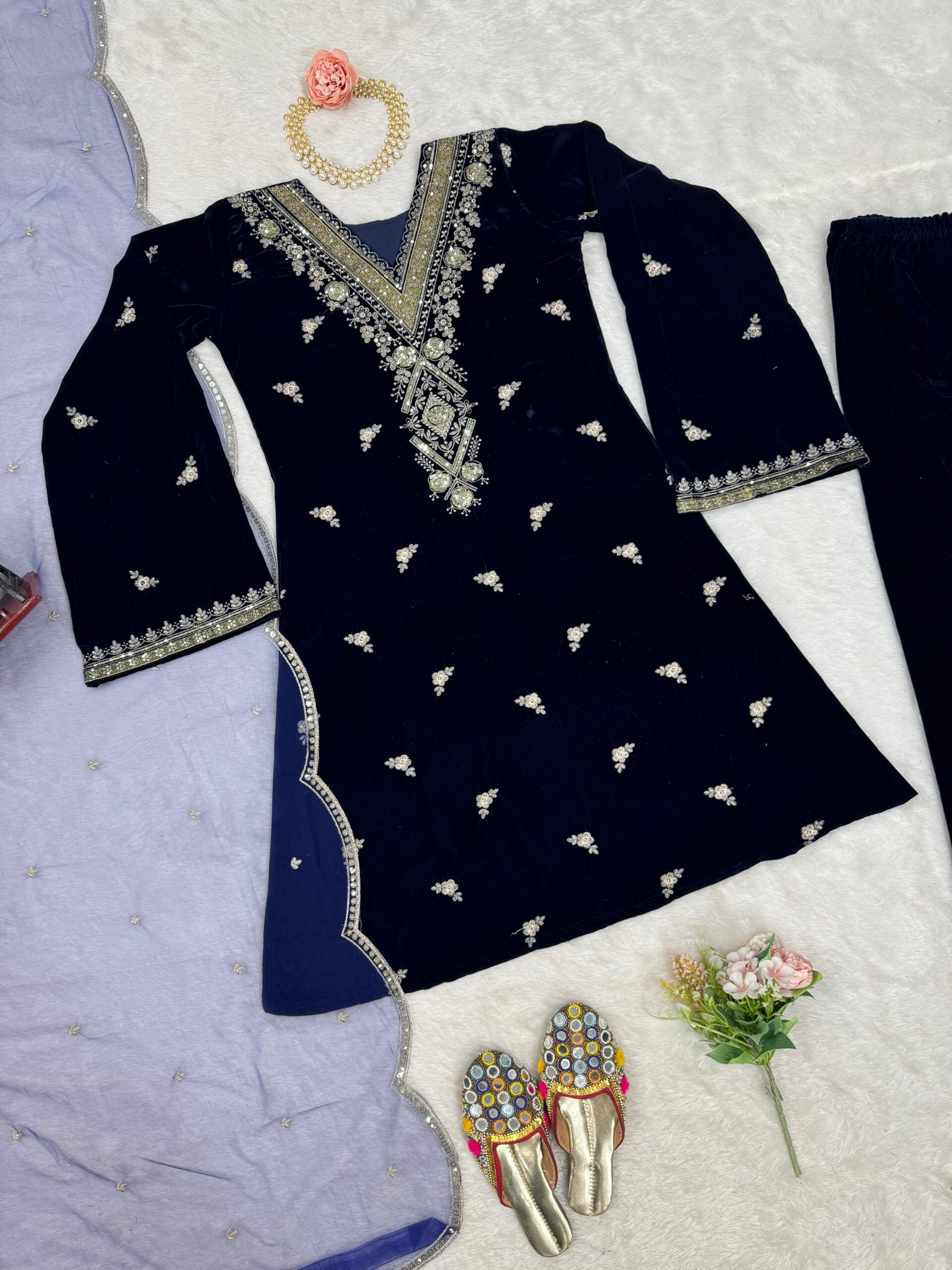 The Allure of Dark Blue Color Viscose Velvet Fabric Sequence Work Palazzo Set
