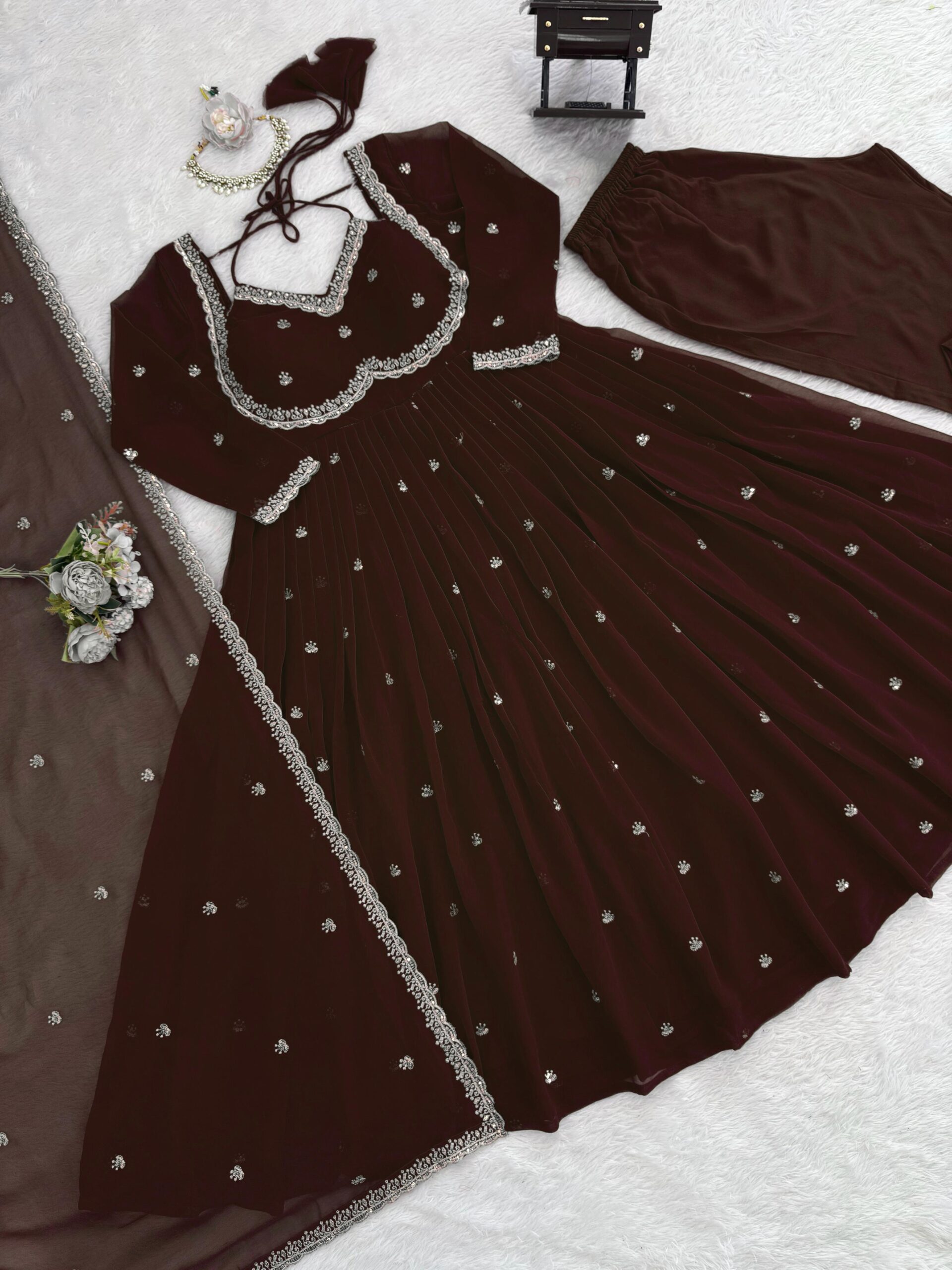 - Discover the allure of Anarkali suits with our stunning Dark Brown faux georgette fabric option adorned with intricate sequence work. This timeless piece not only enhances your ethnic wear collection but also ensures you make a fashion statement at any occasion, from weddings to family gatherings.