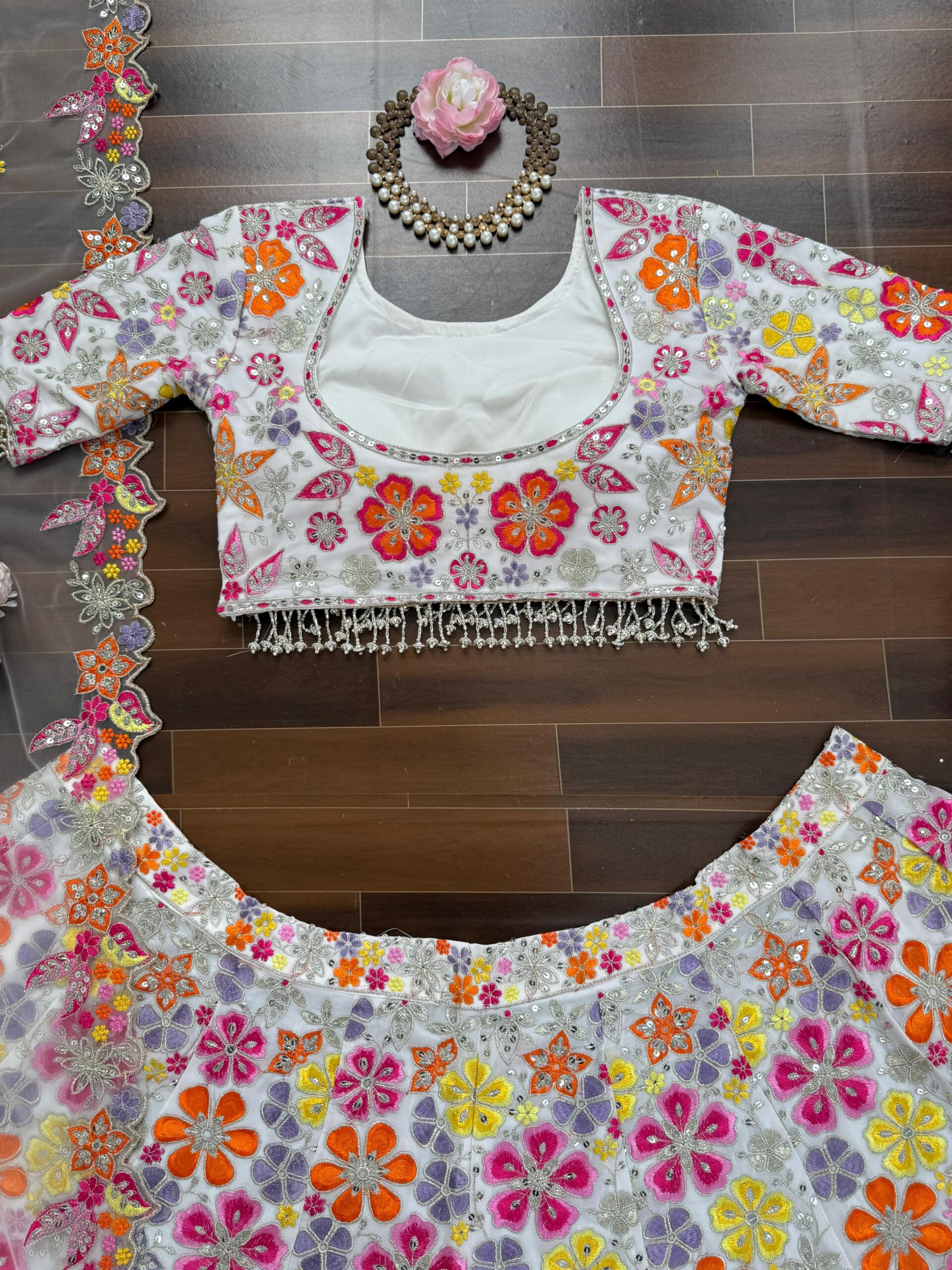 • Discover the elegance of floral lehenga designs, featuring multi-color faux georgette fabrics and stunning sequence work. Perfect for summer weddings and festive celebrations, these lehengas combine tradition with modern style. Lightweight and easy to wear, they exude sophistication and charm, making them an essential addition to any wardrobe.