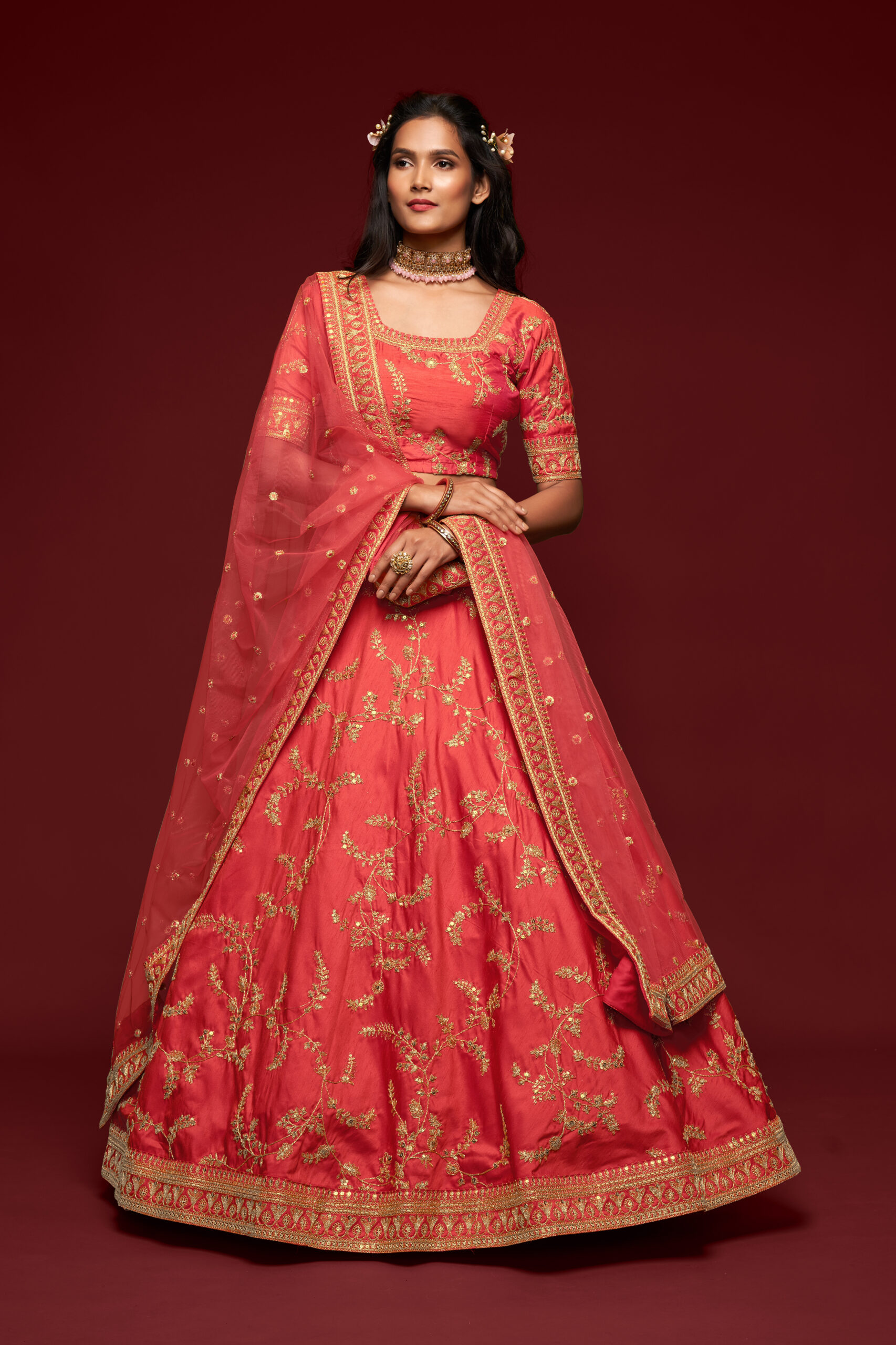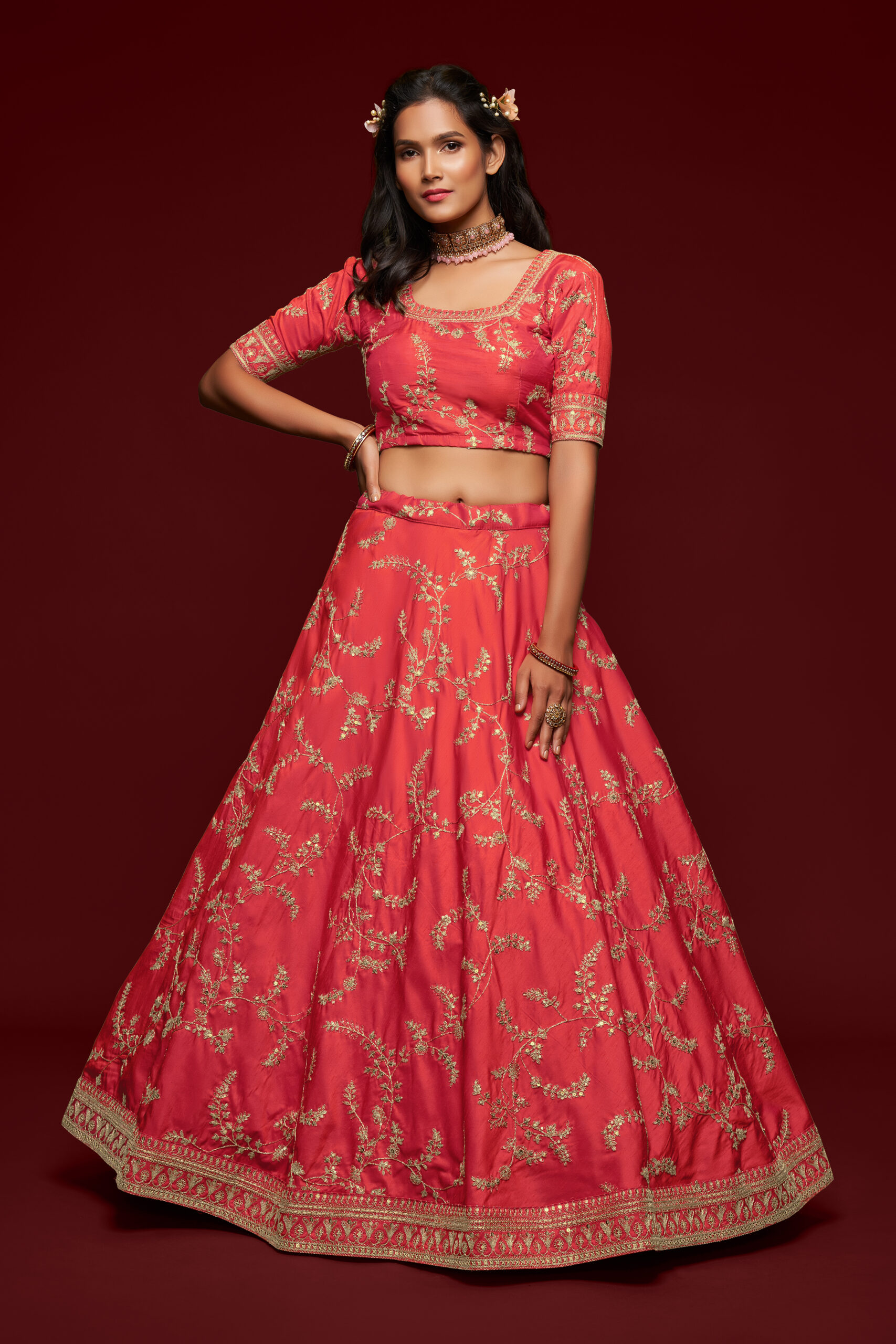 Sequence embroidery is a technique that involves stitching ornamental pieces onto fabric, adding depth and sparkle. When applied to Gajri art silk fabric, this work enhances the garment’s brightness, making it ideal for festive occasions. The shimmering sequences catch the light beautifully, making every movement graceful and enchanting. Choosing a lehenga adorned with such intricate embroidery ensures you make a statement wherever you go.