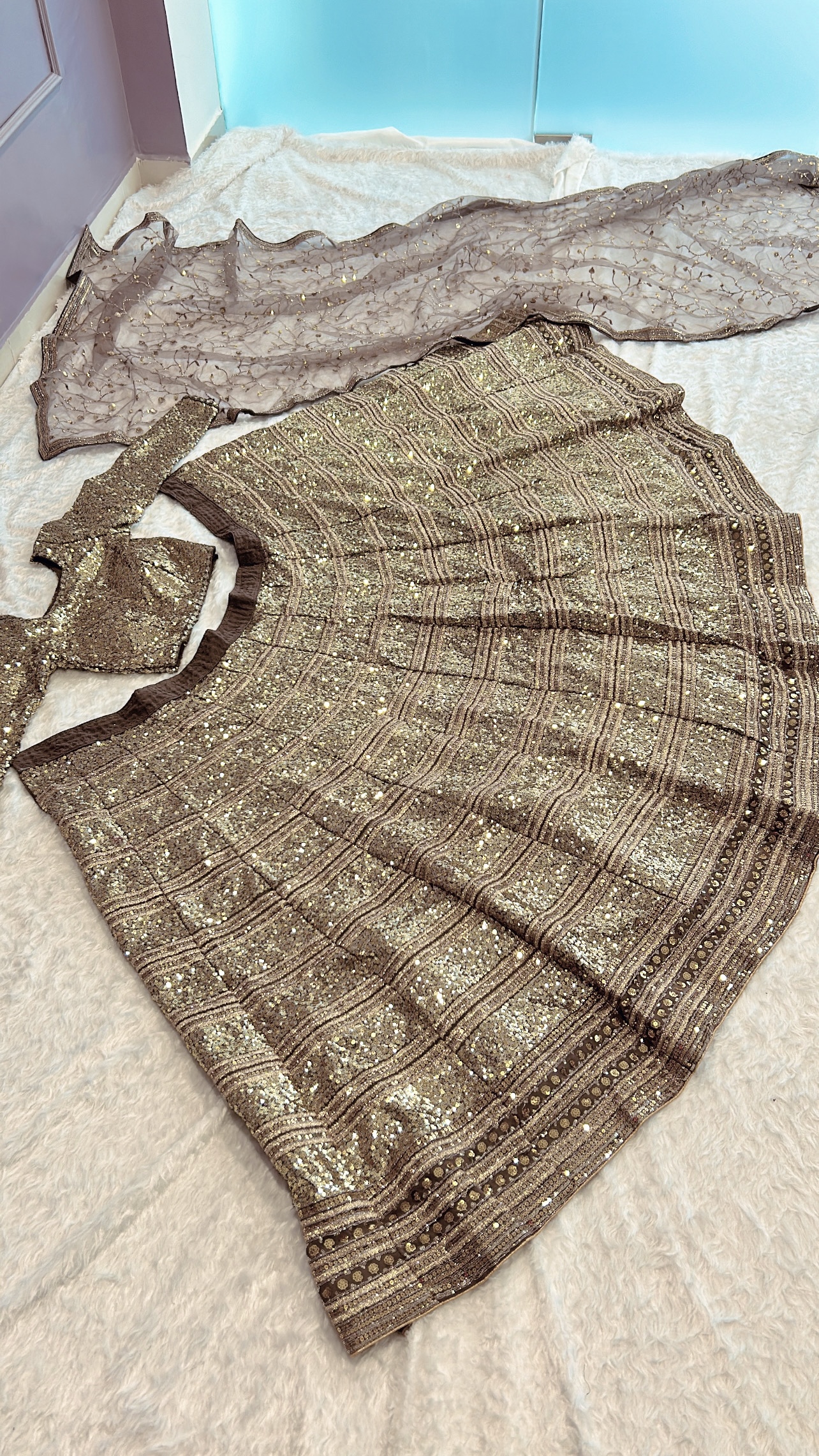 Be the first to review “Gold Color Faux Georgette Fabric Sequence With Jari Work Lehenga”