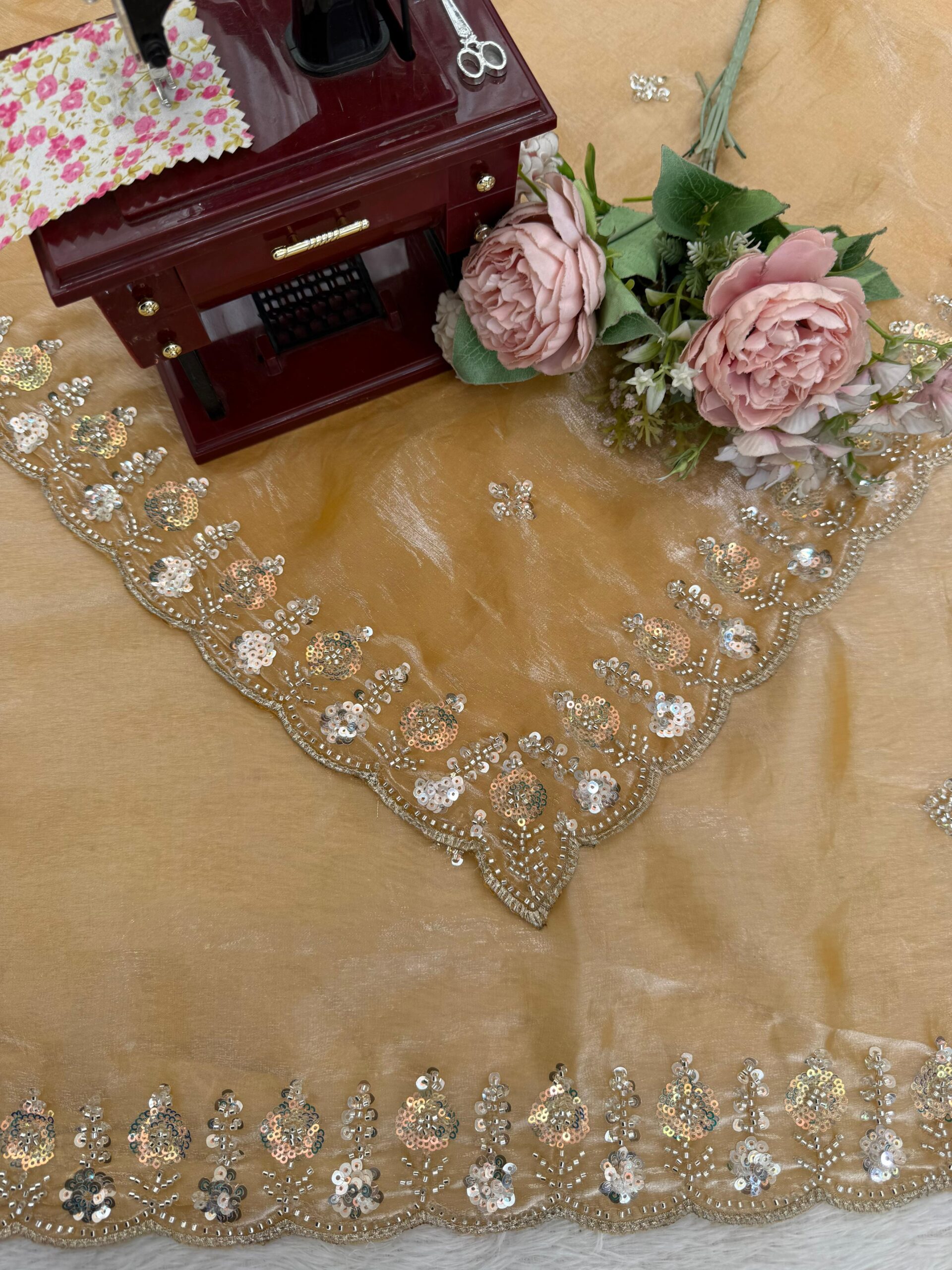 Introduction to the Gold Color Fendi Silk Fabric Saree