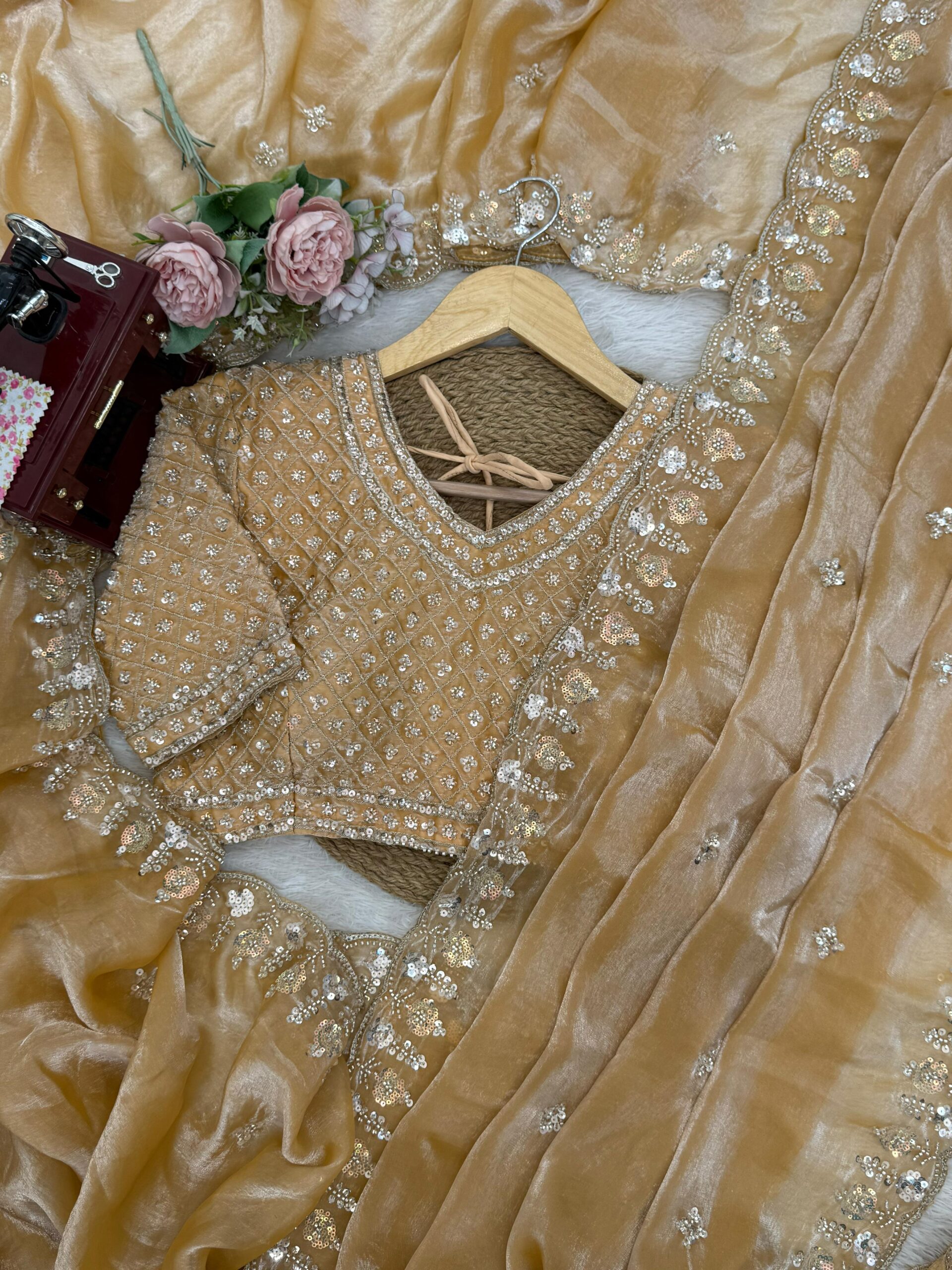 Styling the Gold Bead Work Saree requires minimal effort, as it makes a statement on its own. Pair it with elegant accessories such as statement earrings or bangles to complement its intricate design. Opt for a classic clutch to complete the look, enhancing the overall elegance. Wearing your hair in a sleek bun or loose waves can further showcase the saree’s captivating features, ensuring you stand out at any occasion.