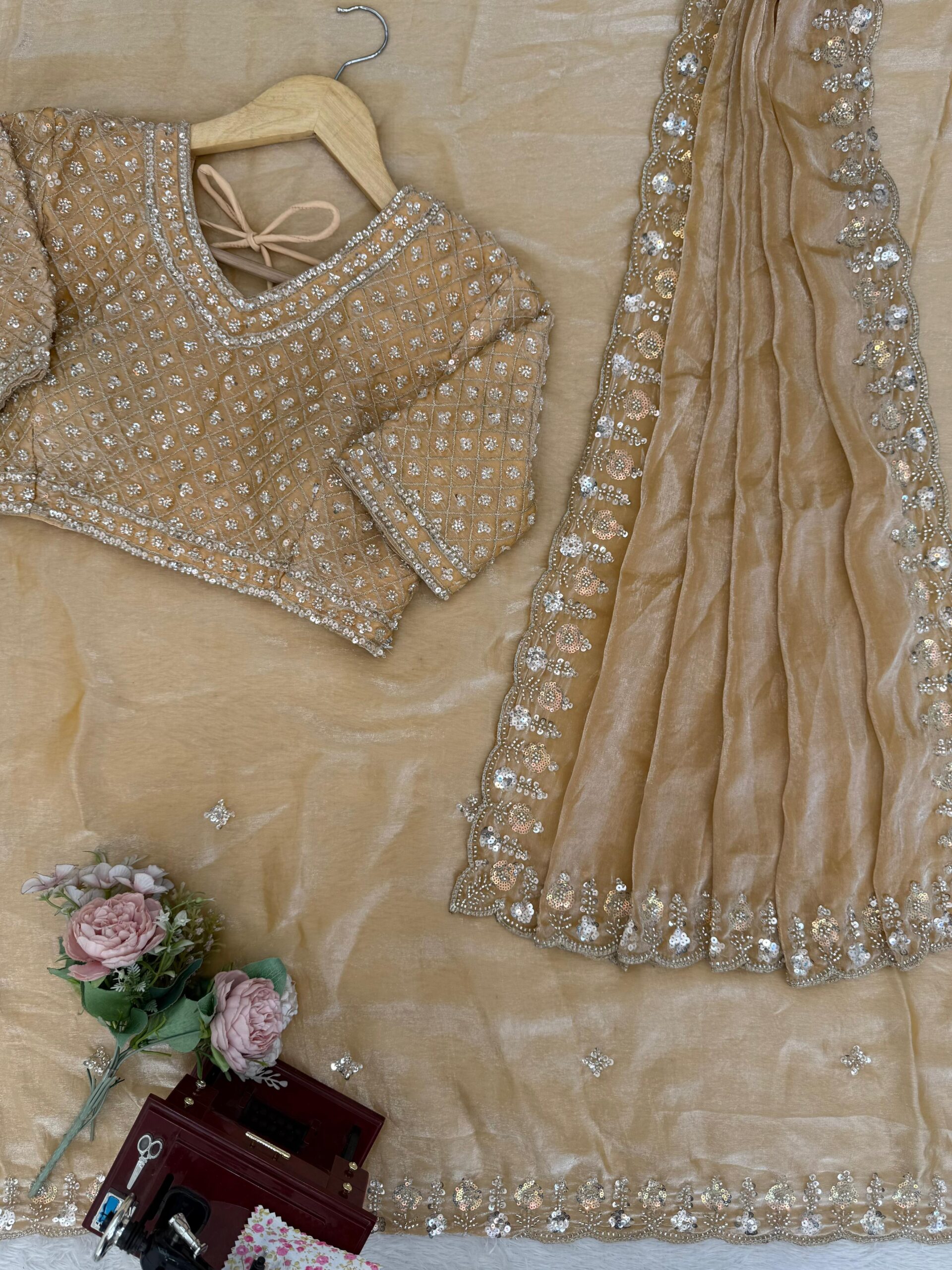 Additionally, the exquisite bead work With Sequence Work Saree embellishments are meticulously applied, adding a sparkle that catches the light beautifully. This attention to detail elevates the saree, making it suitable for both traditional and contemporary styling.