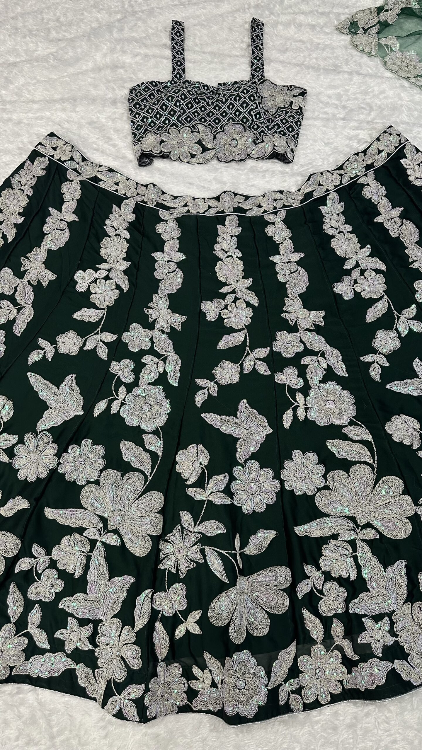 Crafted from premium kasturi silk georgette, this fabric is not only soft and lightweight but also drapes beautifully, enhancing the silhouette. The rich Green hue adds depth and allure, making it a striking choice for any wardrobe. One of the standout features of this lehenga is the exquisite sequence work that adorns it, creating a stunning play of light and sparkle.