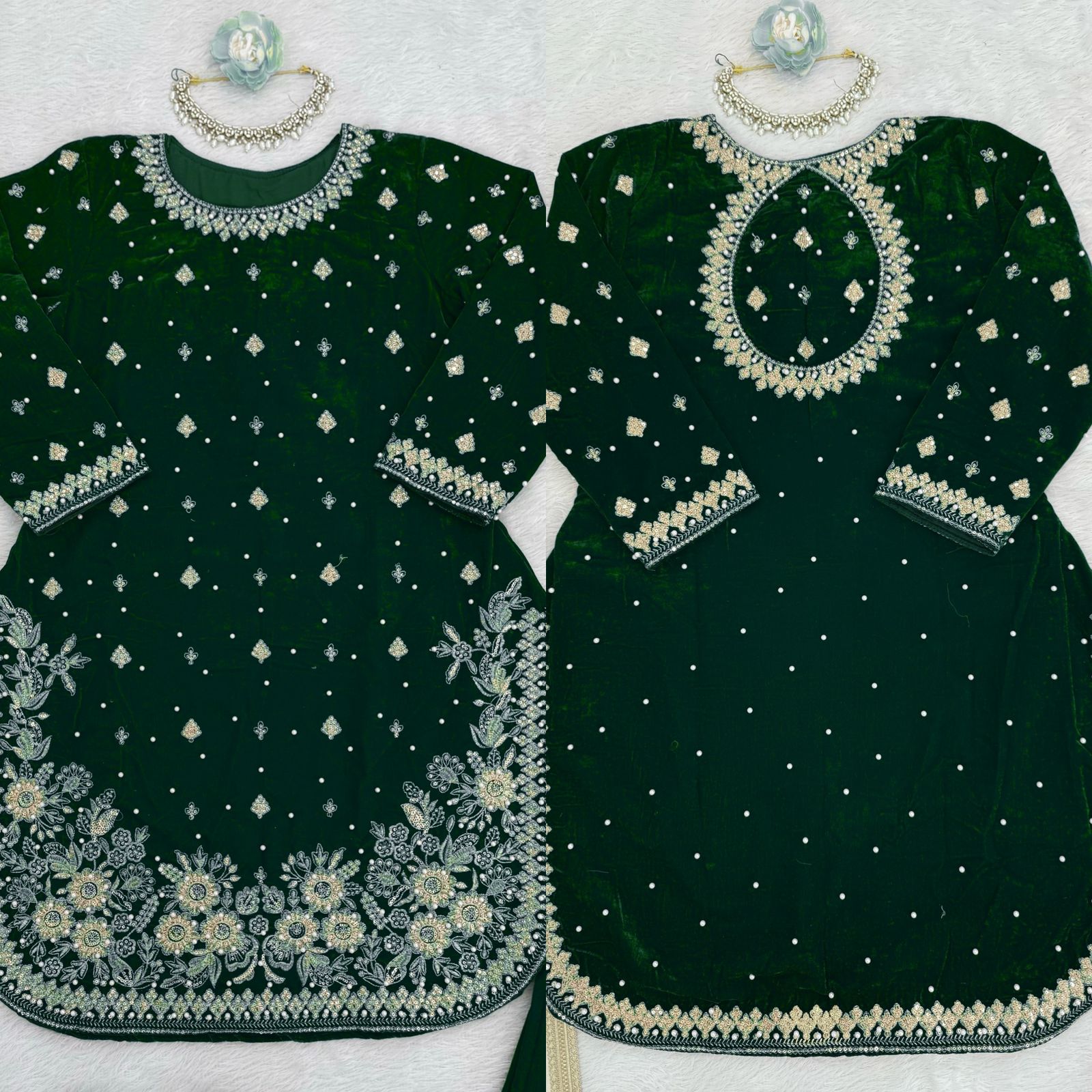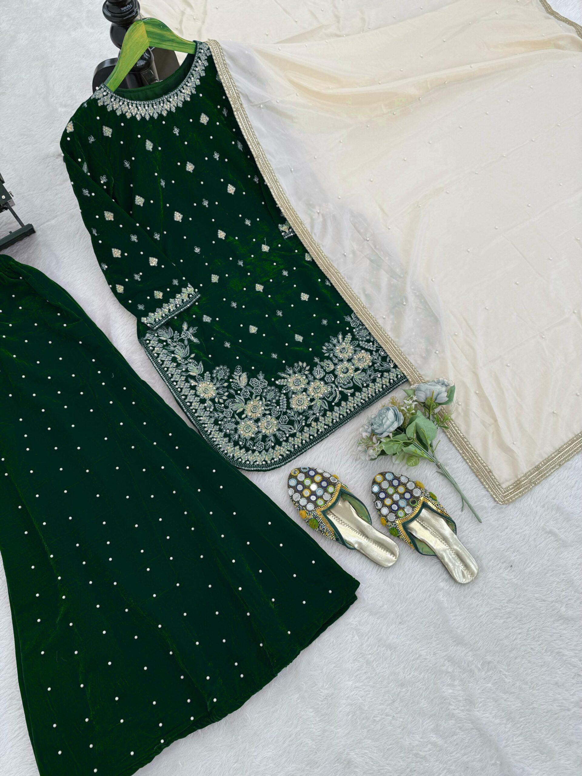 In conclusion, the Green color viscose velvet fabric pearl work palazzo suit is a perfect blend of elegance and comfort. Whether you’re attending a wedding or celebrating a festival, this outfit will ensure you make a memorable impression.