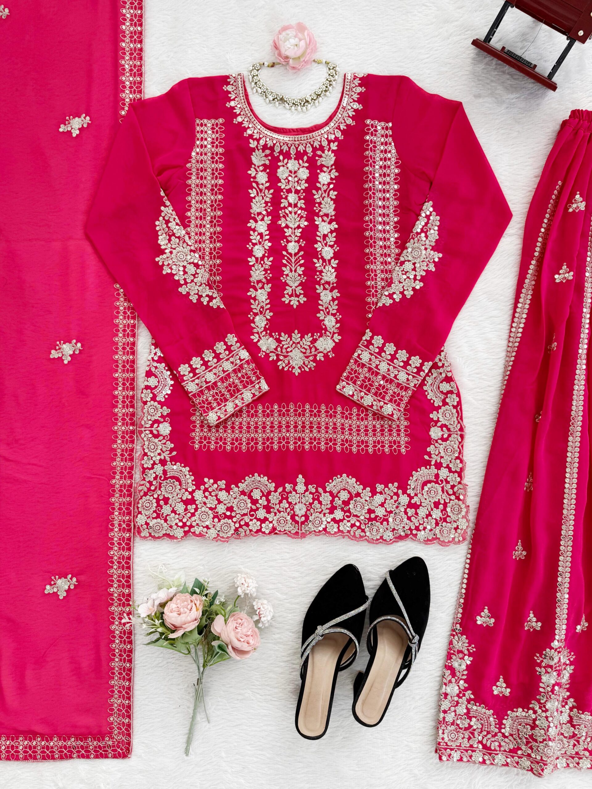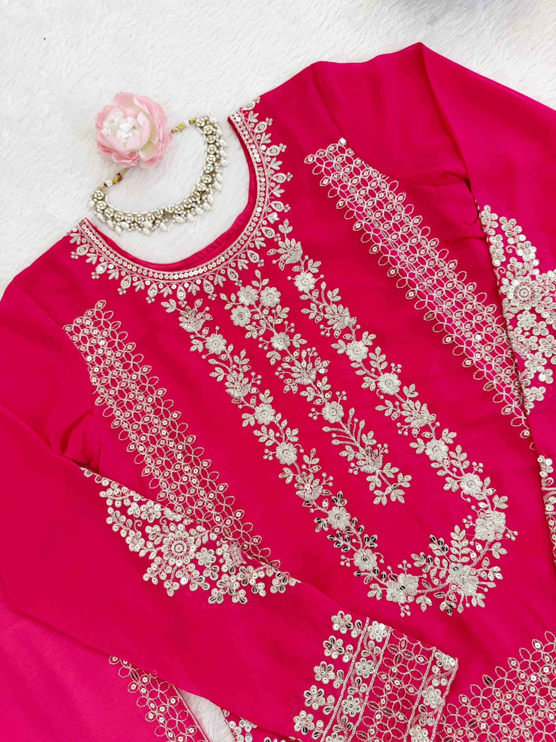 To enhance your look with the pink faux georgette palazzo suit, opt for minimalistic jewelry that complements the intricate sequence work without overwhelming it. A pair of traditional juttis, along with a matching clutch, can further elevate your ensemble. Completing the look with soft, neutral makeup will ensure your outfit remains the focal point.