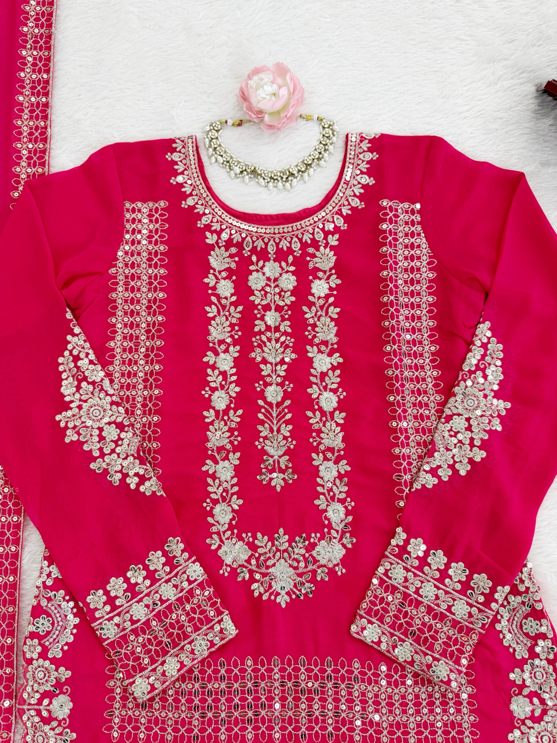 - Celebrate Karva Chauth with elegance by choosing a stunning pink faux georgette palazzo suit. This lightweight and breathable outfit is perfect for long hours of fasting while ensuring you look glamorous with its exquisite sequence work.