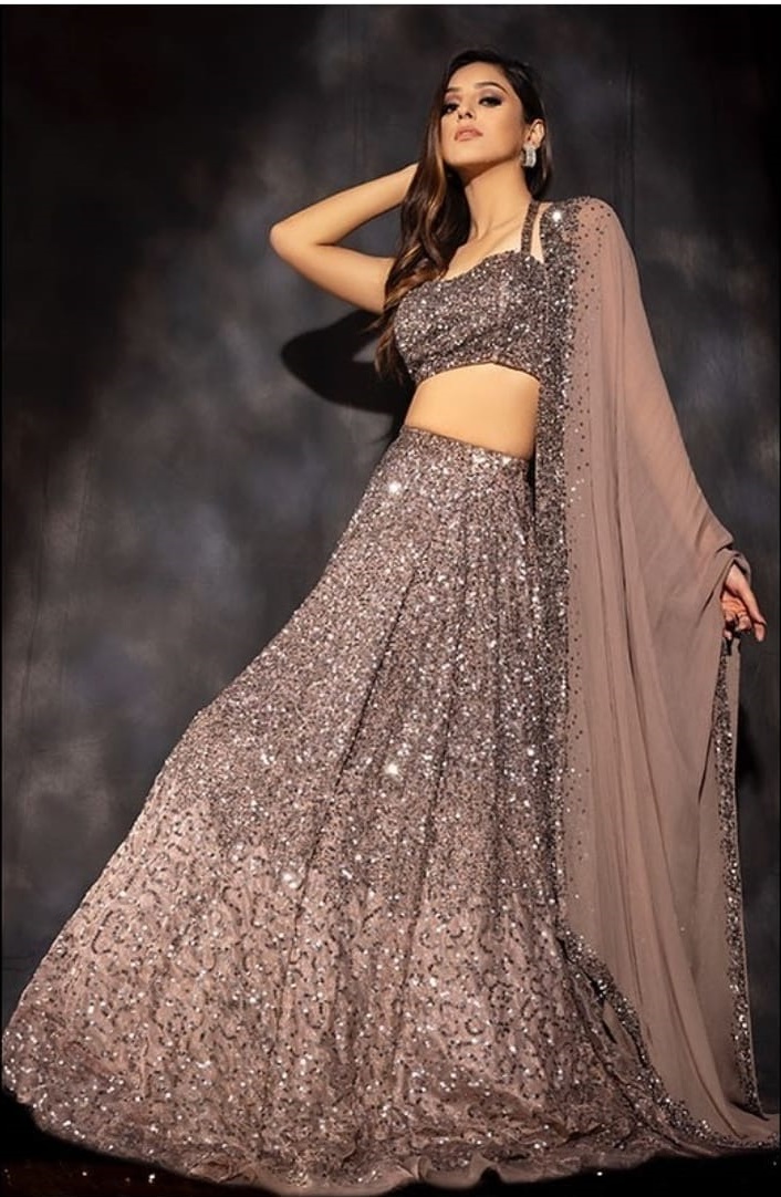 - Discover the elegance of Diamond Silk Georgette fabric in the latest Light Brown lehenga designs. This delicate and lightweight fabric is complemented by intricate Heavy Double Sequence Work. As a result, it creates show-stopping pieces perfect for weddings and festive celebrations.