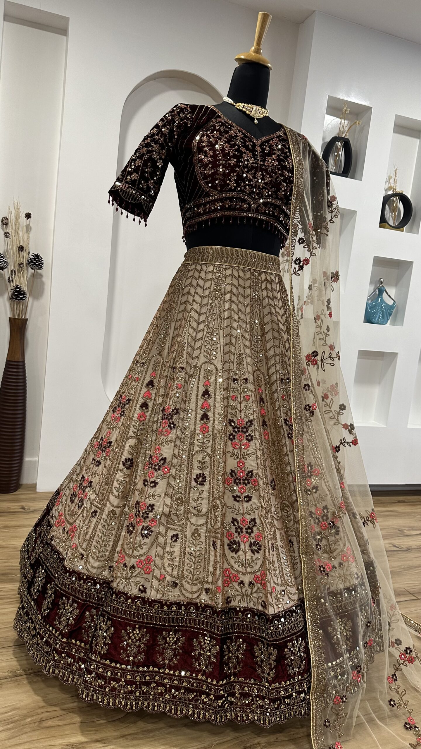 One of the most captivating features of the bridal lehenga is its intricate Dori And Sequence With Thread Work Along With Velvet Border. The shimmering sequences catch the light from every angle, adding an enchanting sparkle. As a result, this sparkle transforms a simple bridal outfit into a stunning statement piece. This is perfect for the most important day in a woman’s life.