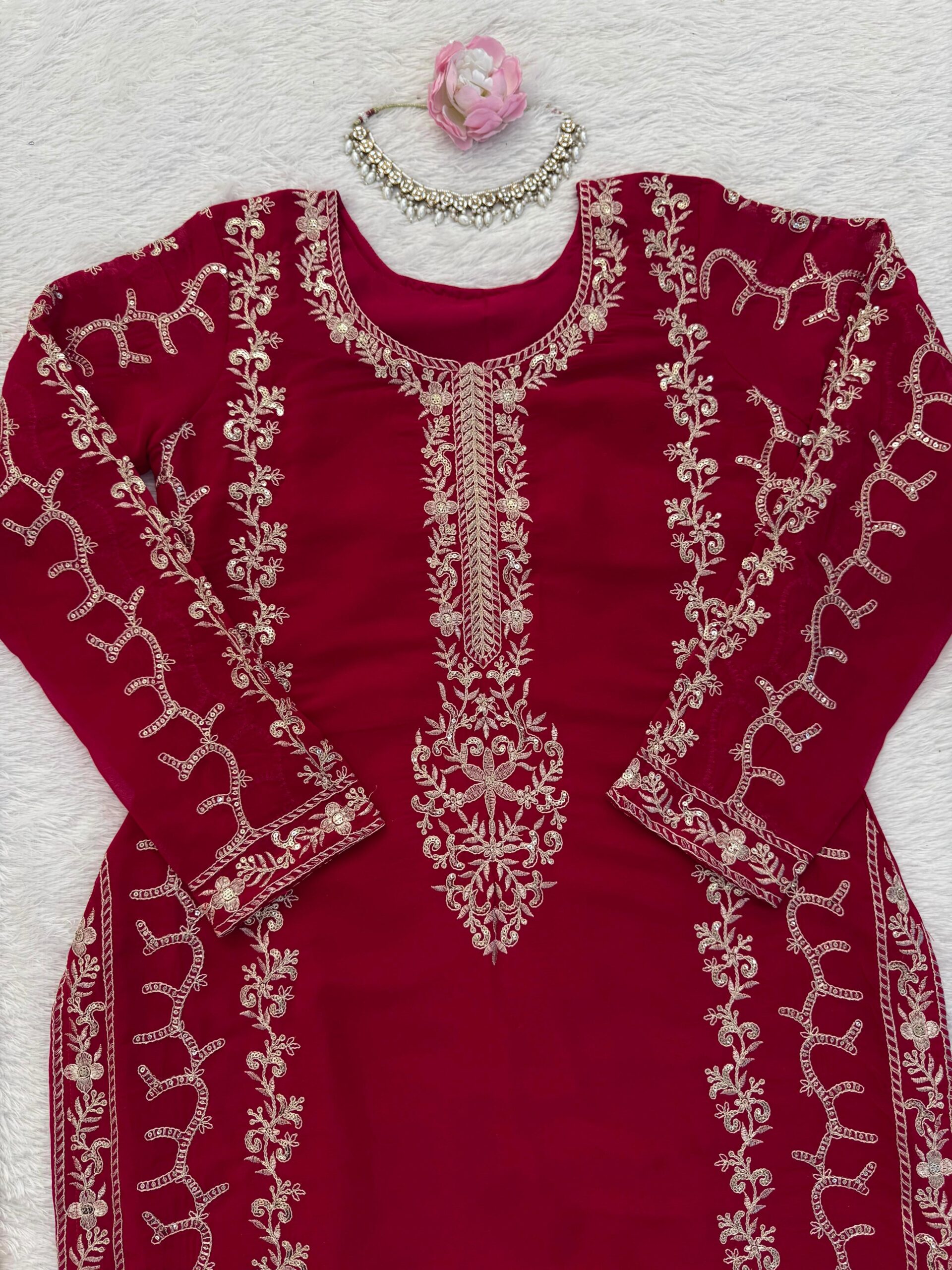 Elegance Redefined: The Maroon Color Heavy Faux Georgette Fabric Thread With Sequence Work Palazzo Suit