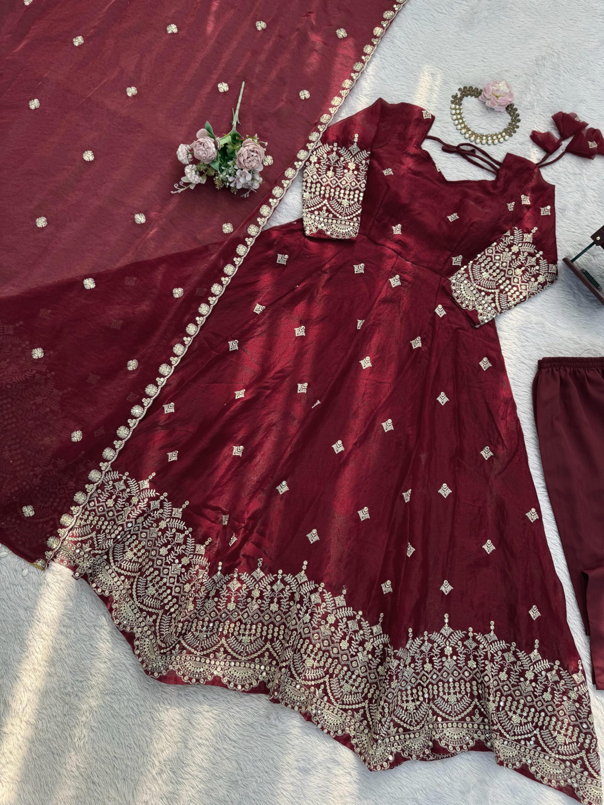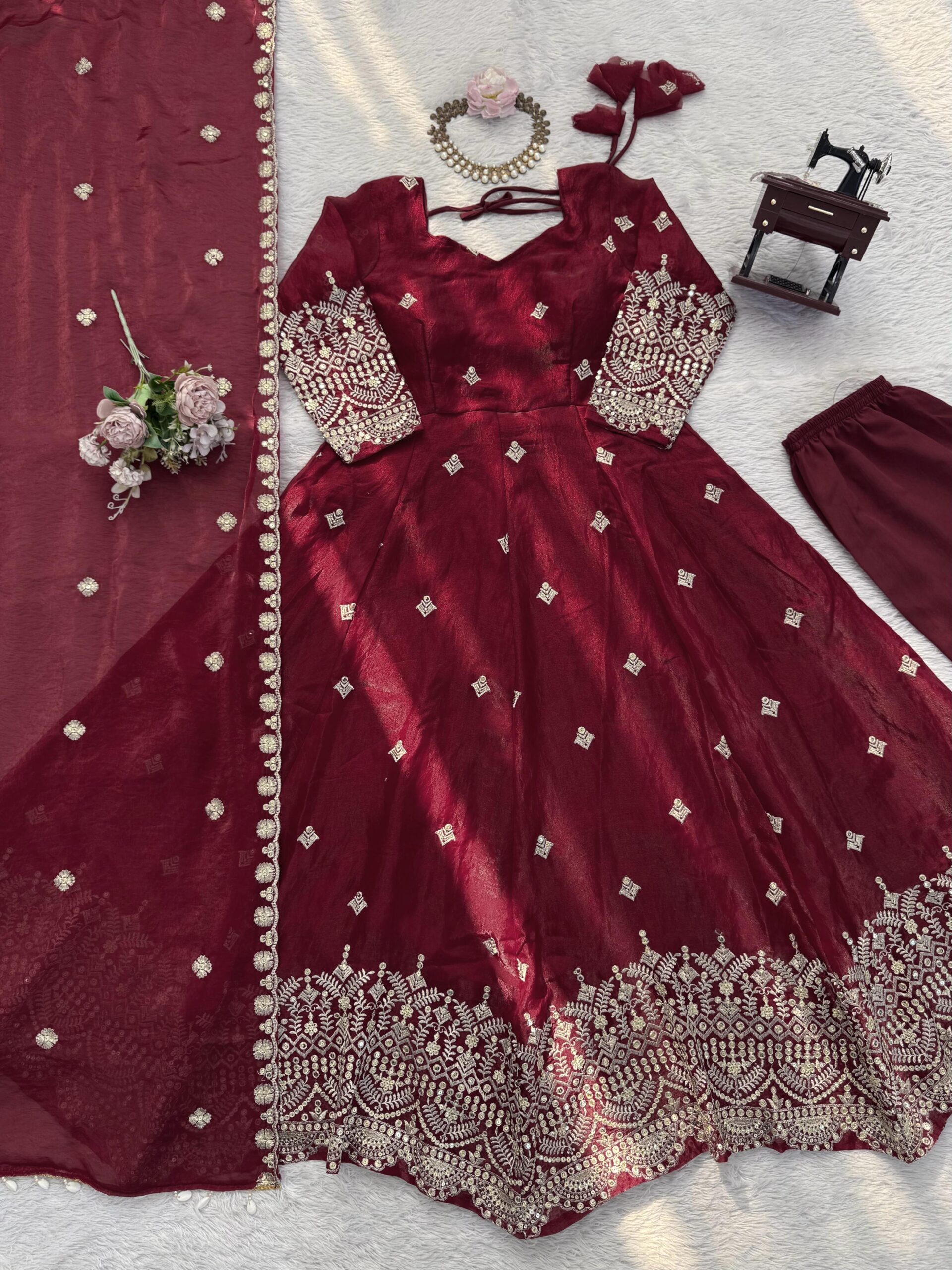 Elevate Your Style with a Maroon Color Fendi Silk Fabric Sequence Work Stylish Gown