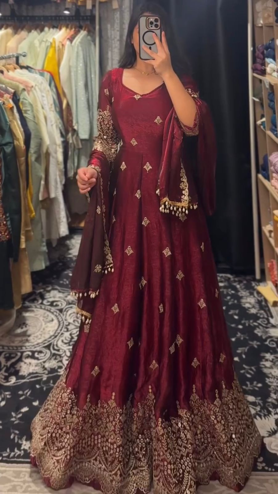 This gown is not just a piece of clothing; it’s a statement of style and glamour. Whether you attend a special event or celebrate a significant milestone, a Maroon color Fendi Silk fabric Sequence Work gown will undoubtedly make you feel special and look fabulous!