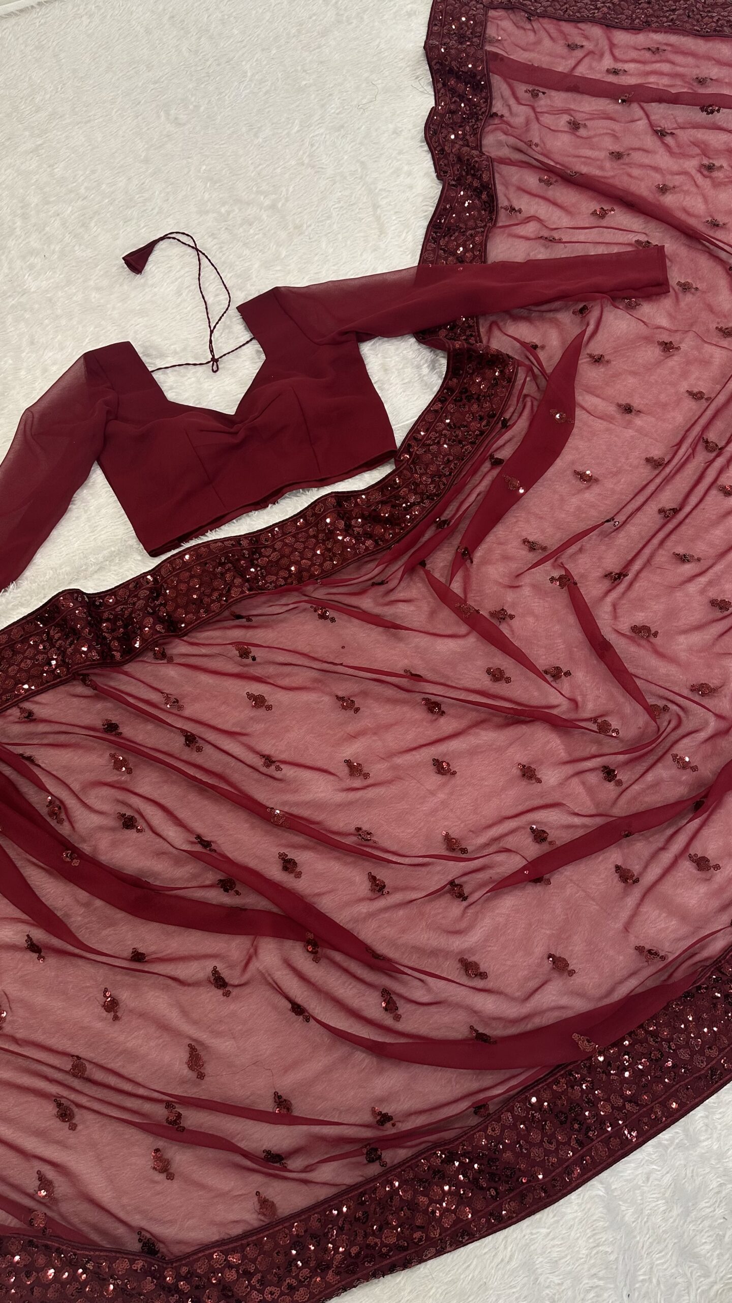Enhancing the beauty of the maroon Georgette saree is the exquisite sequence work. The intricate design not only enhances the visual appeal. It also catches the light brilliantly, allowing the wearer to sparkle and shine. This blend of Georgette creates a stunning contrast, celebrating the art of traditional Indian craftsmanship.