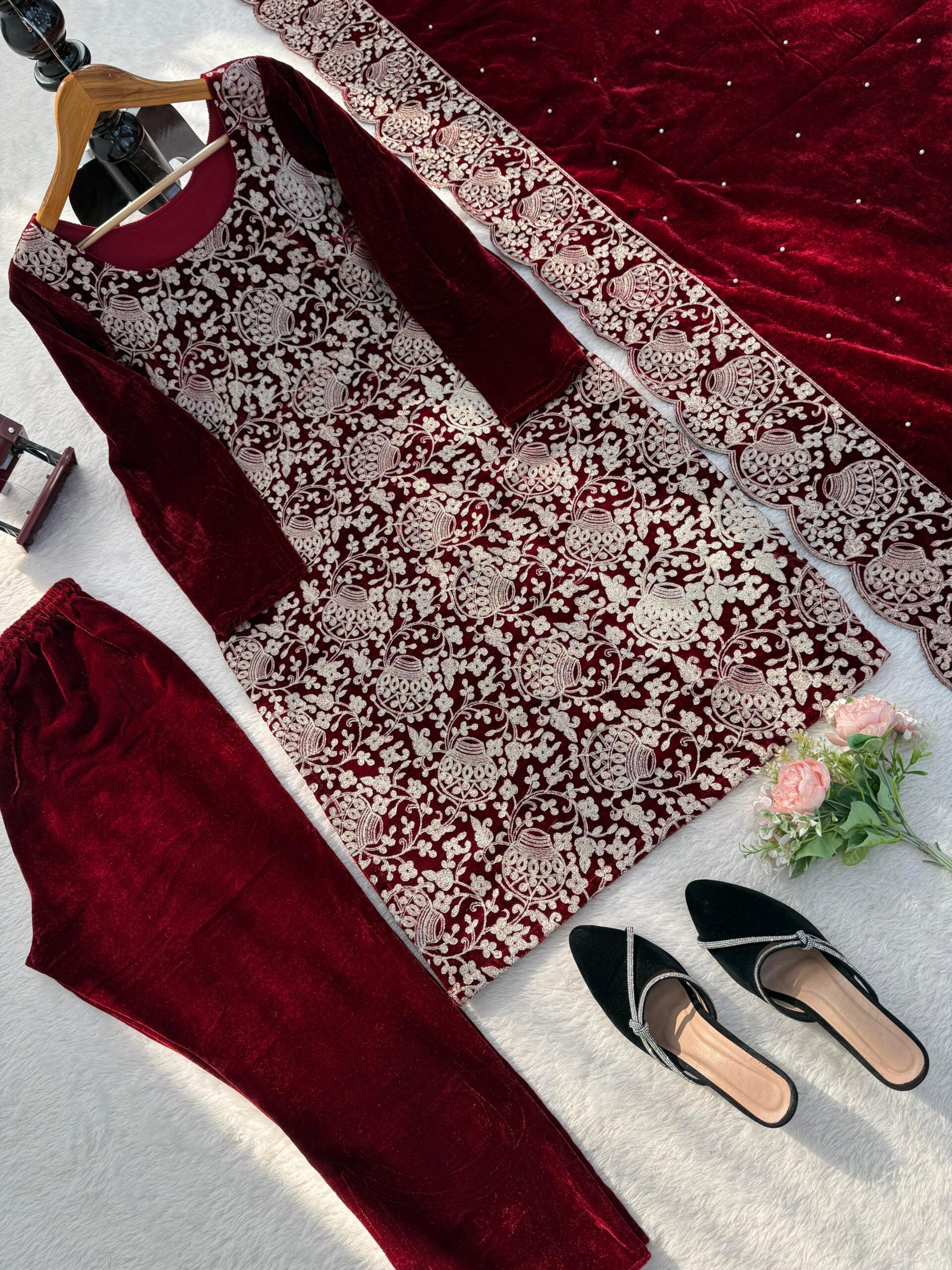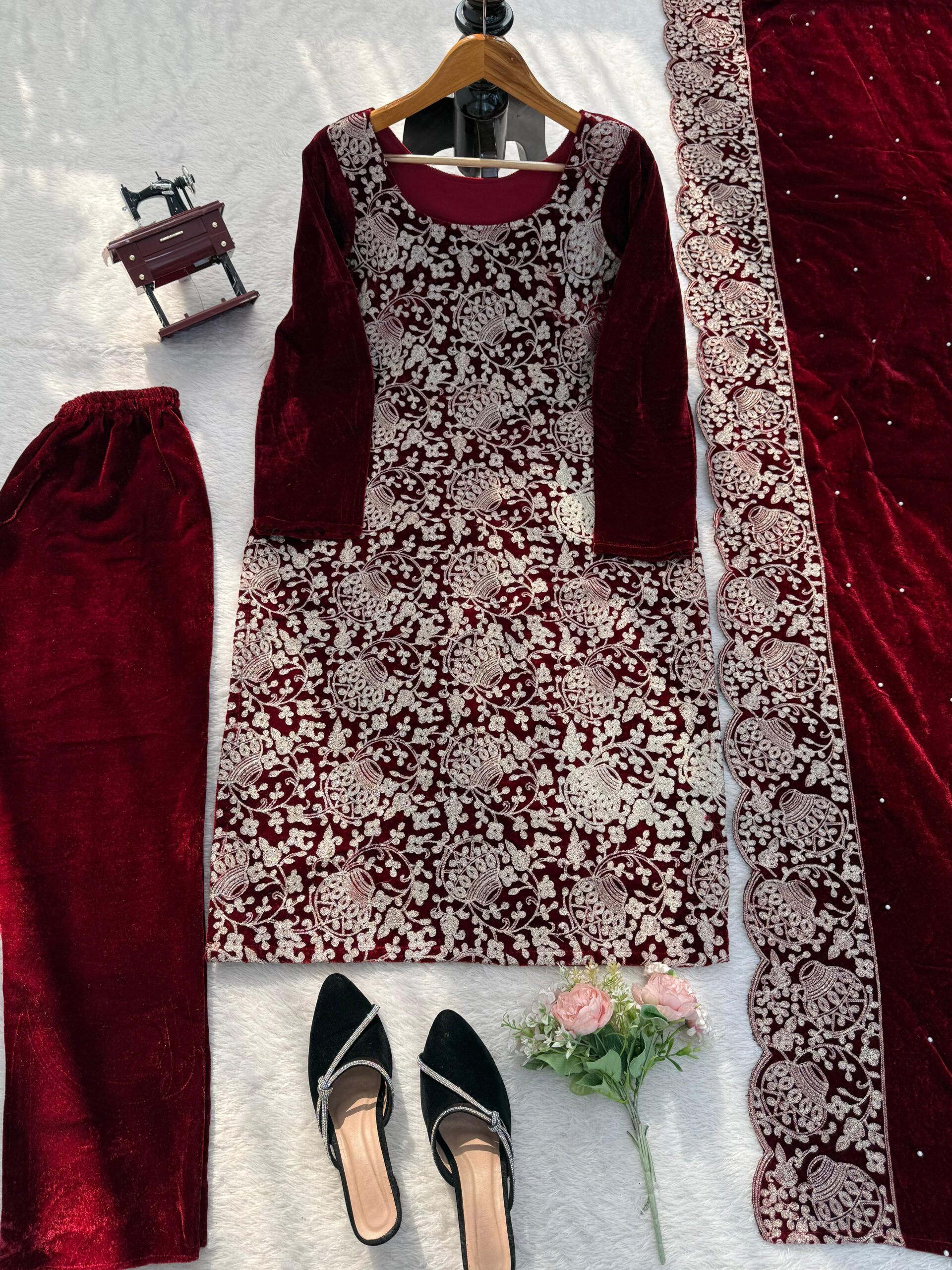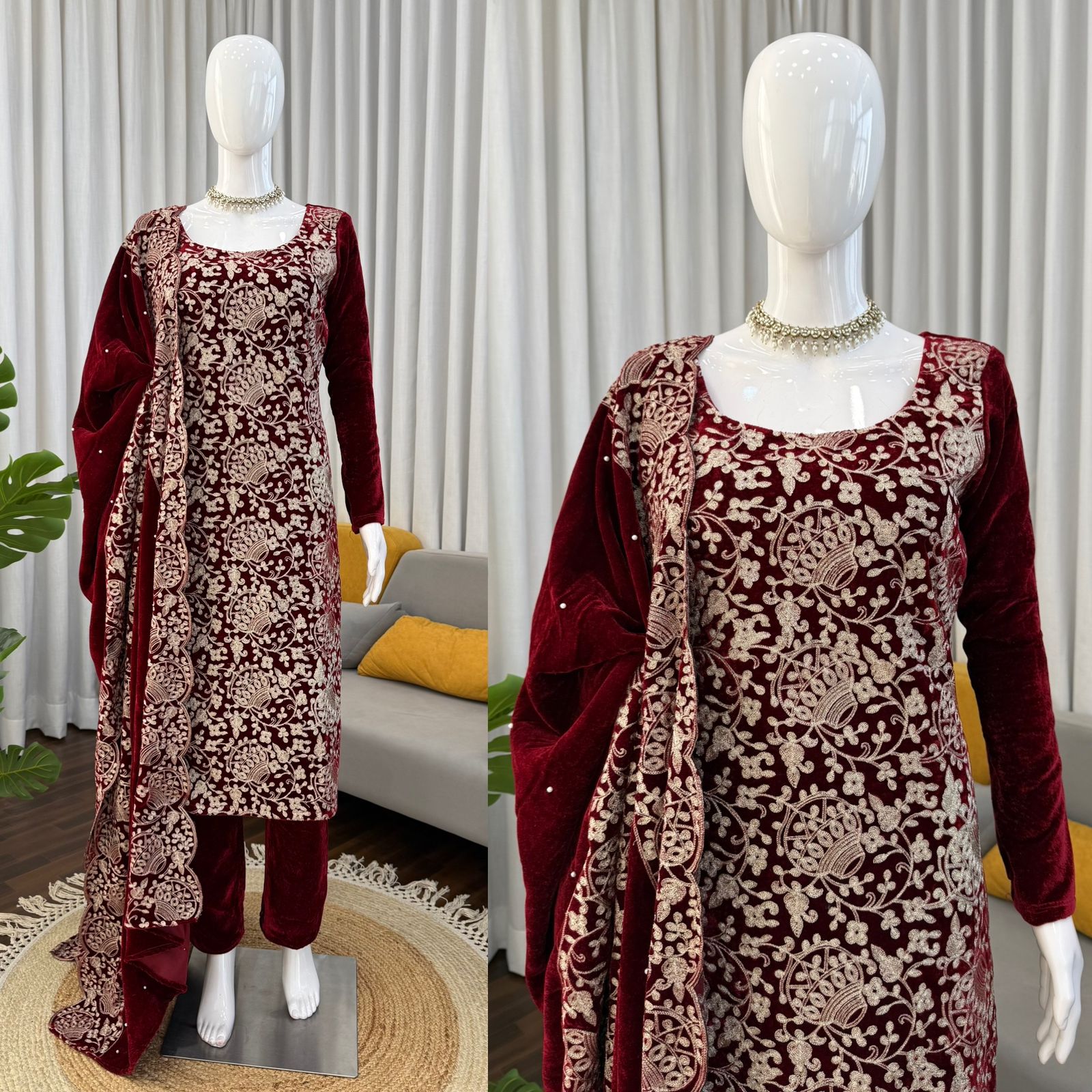The Allure of Maroon Color Viscose Velvet Fabric Chain Stitch Work Suit