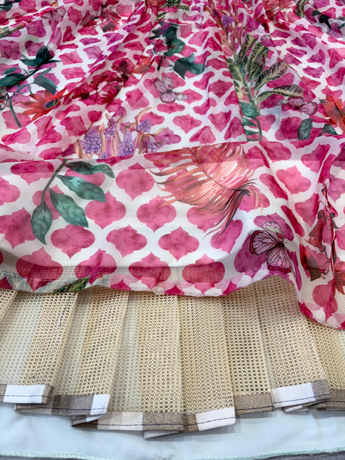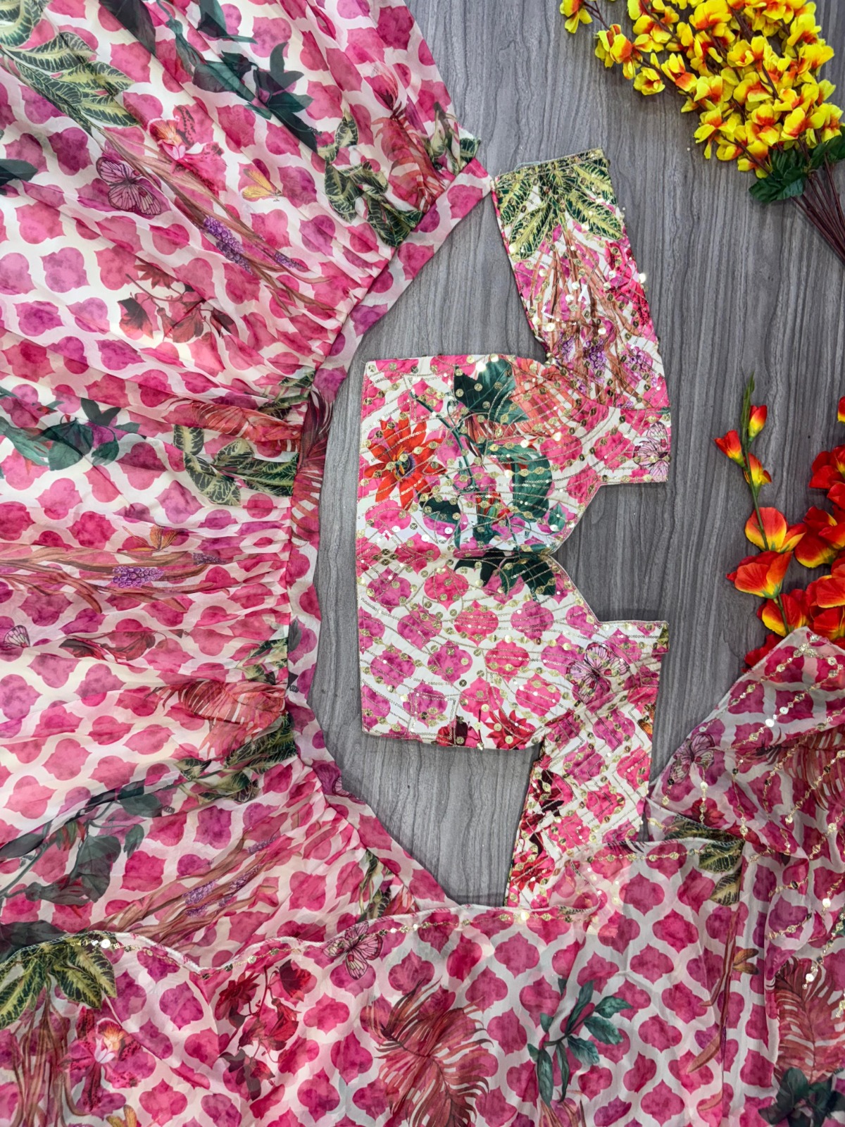 Tabby Organza Silk is known for its lightweight and translucent characteristics. When tailored into a lehenga, it creates a flowy silhouette that elevates any celebration. Moreover, the addition of exquisite Beautiful Floral Print And Embroidery Work With Sequence Work enhances the richness of the fabric.