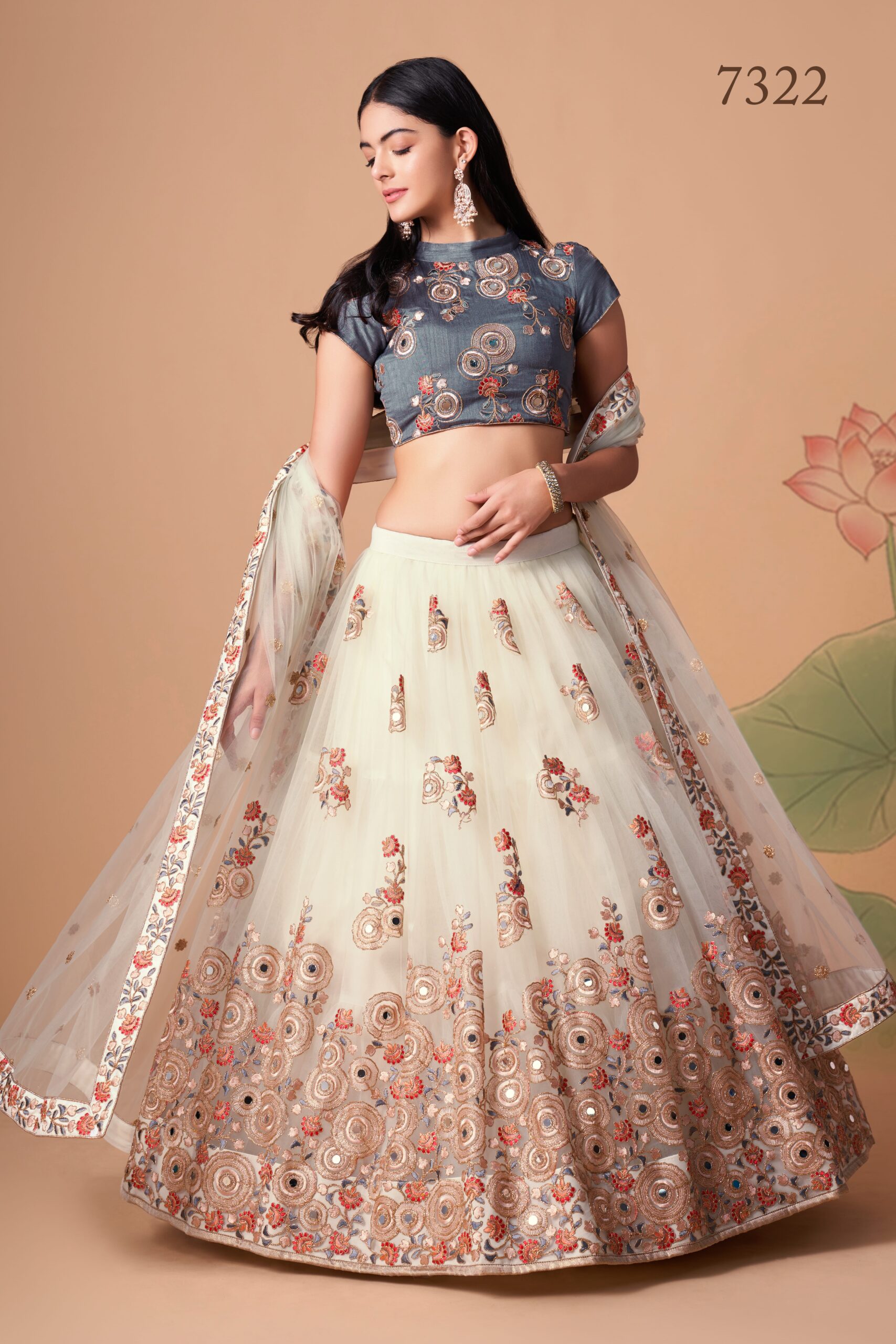 Complementing the sequence embroidery, mirror work is another timeless technique that adds an extra dimension to the Off White color soft net lehenga. Traditionally used to reflect light and colors, mirror work enhances the wearer’s look, creating an eye-catching combination of texture and shine. This embellishment is perfect for evening events, ensuring that your lehenga stands out in any gathering, reflecting the vibrant atmosphere of Indian celebrations.