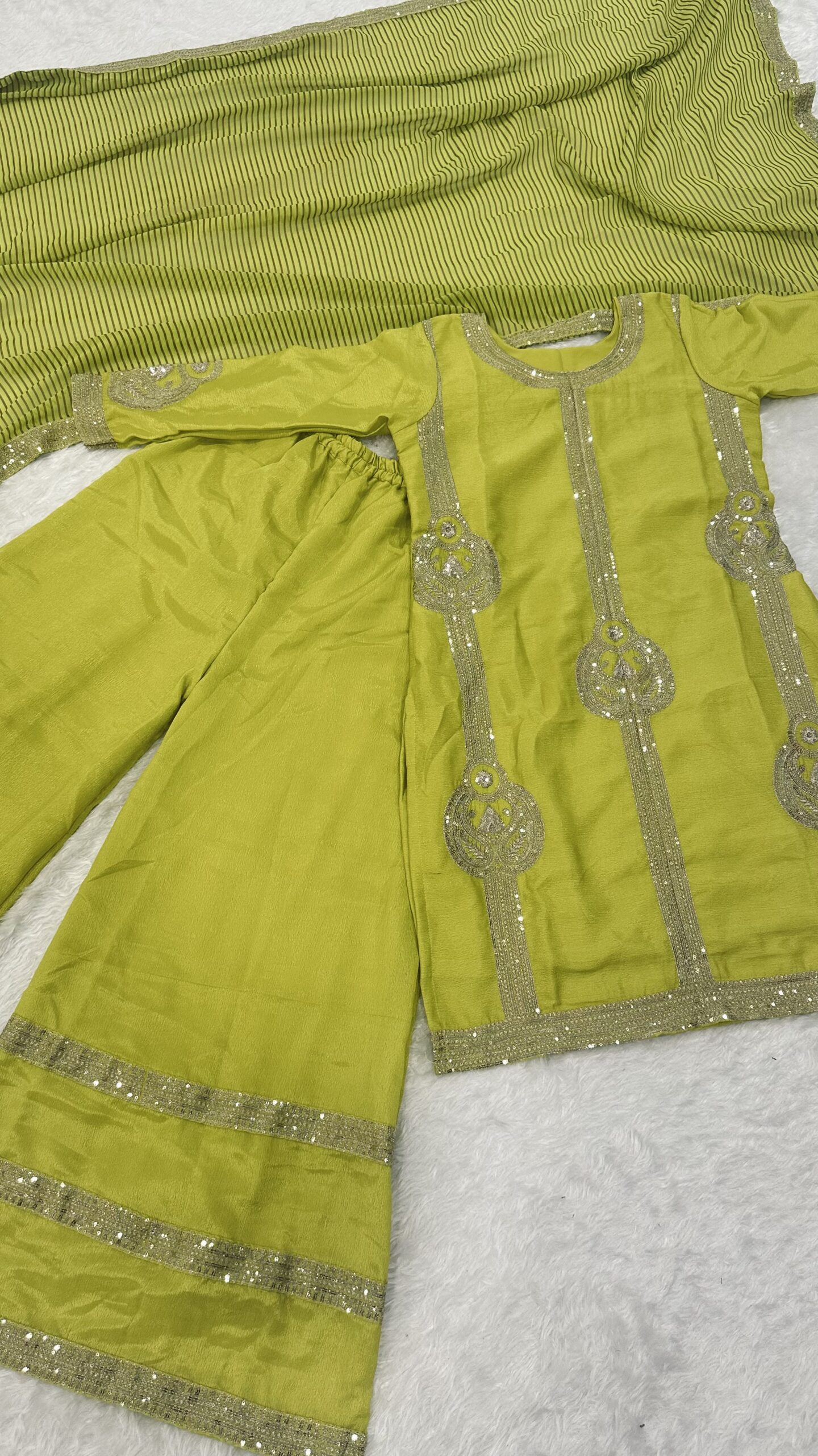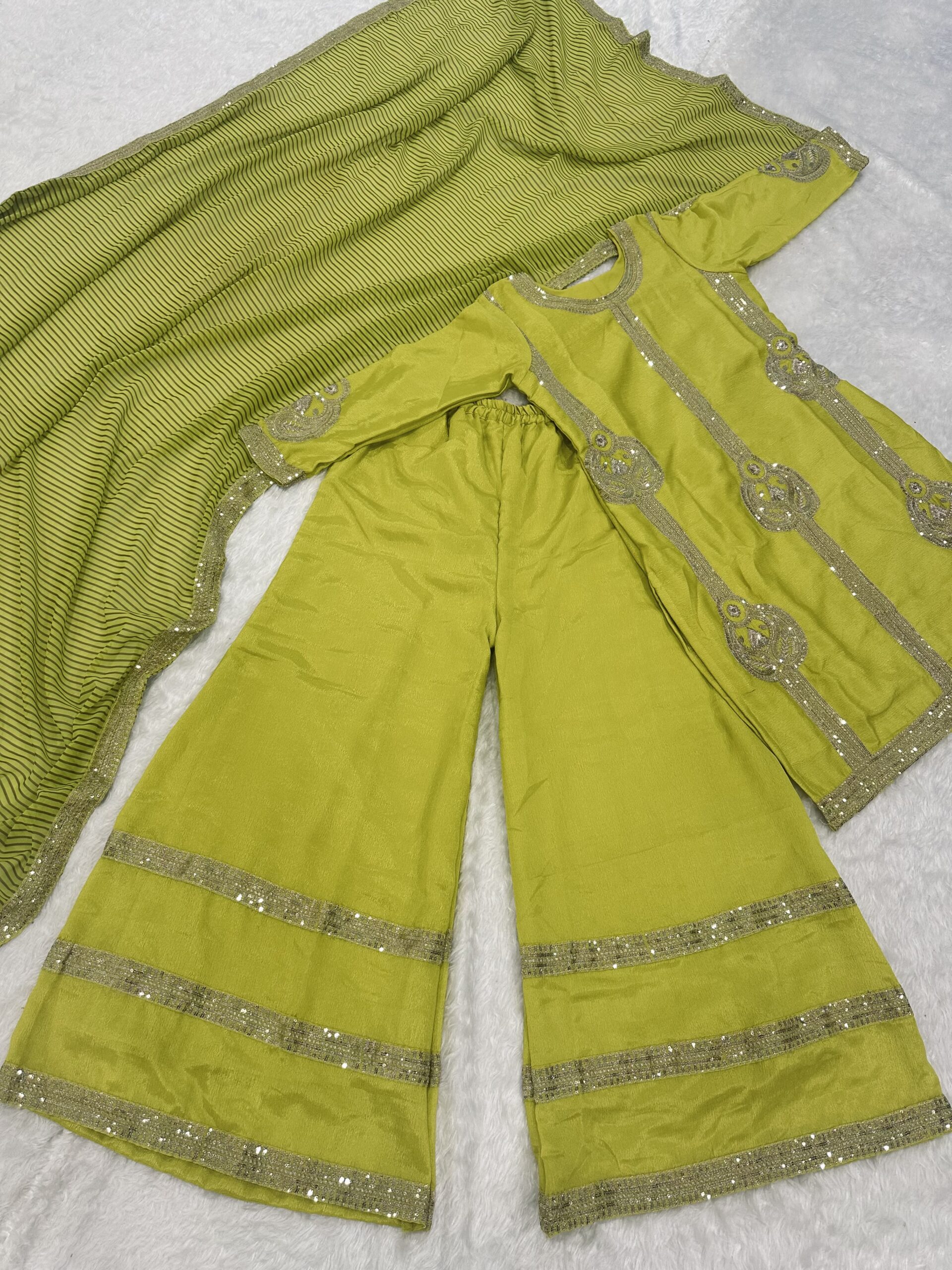 In conclusion, investing in a Parrot color Chinon Silk fabric Sequence Work And Jari Work Palazzo Set not only adds a delightful pop of color to your collection. It also ensures you look effortlessly chic at any event. Embrace this beautiful attire and make a statement wherever you go!