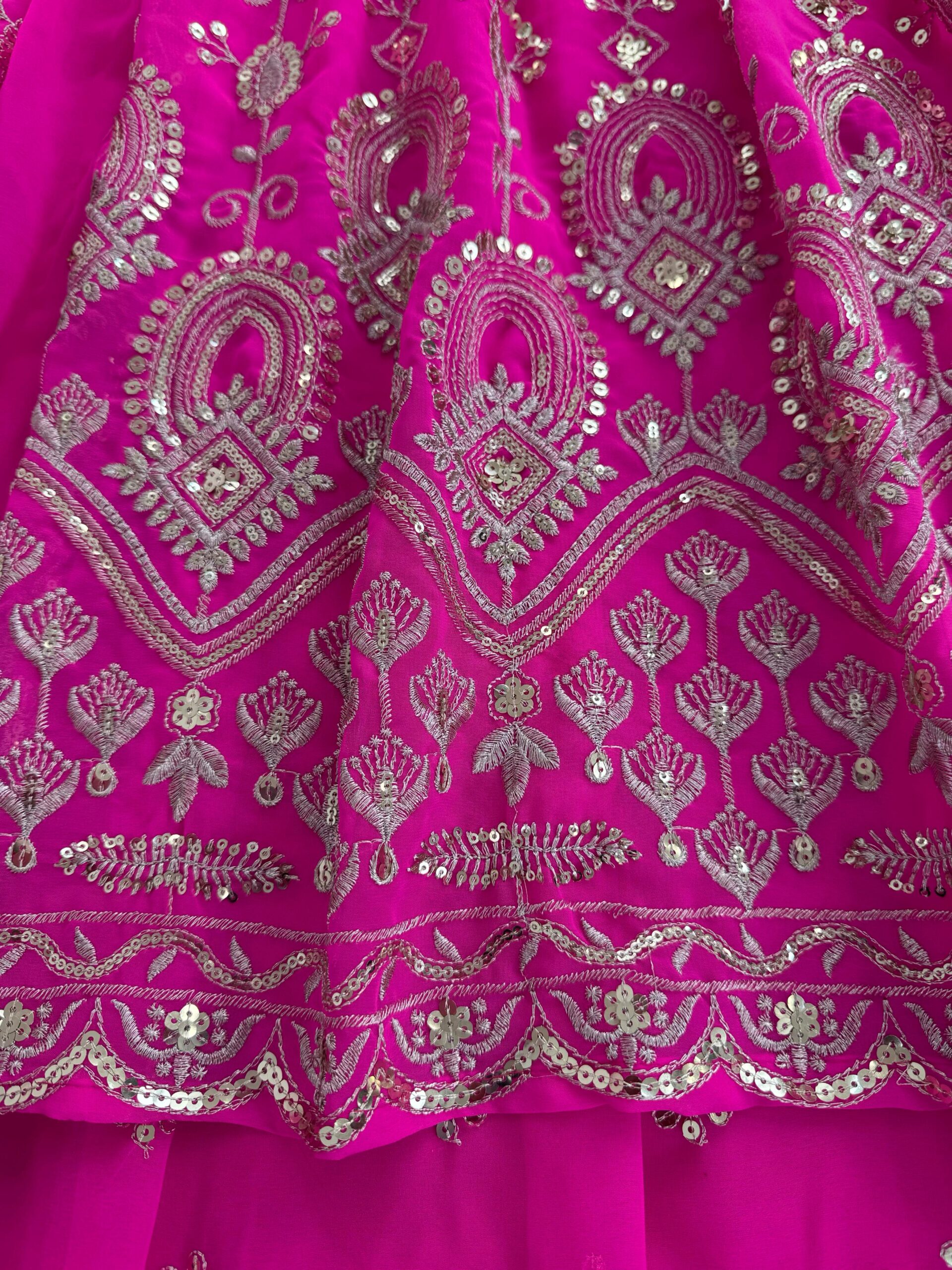 The use of faux georgette fabric in this lehenga set adds a lightweight texture that drapes beautifully. This pink fabric is not only soft against the skin but also allows for easy movement, making it ideal for dancing and celebration. The sequence work on the top enhances the overall look, adding a touch of sparkle that is perfect for any festive occasion.
