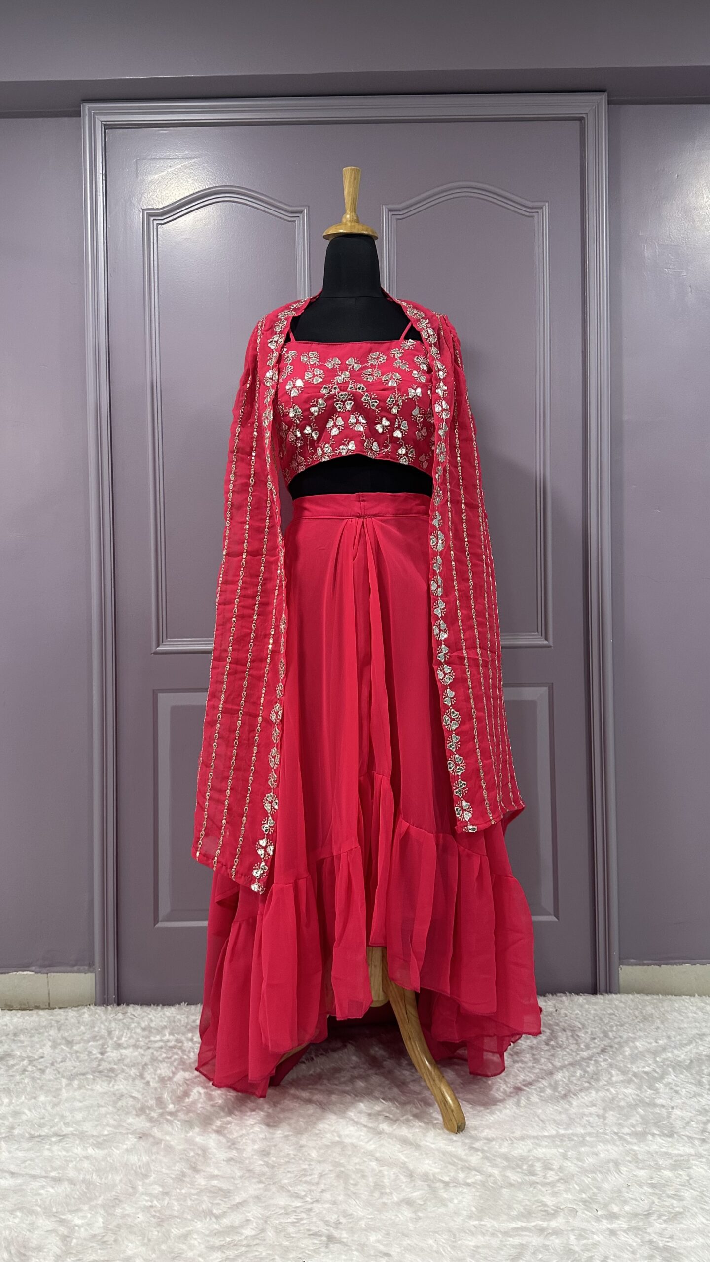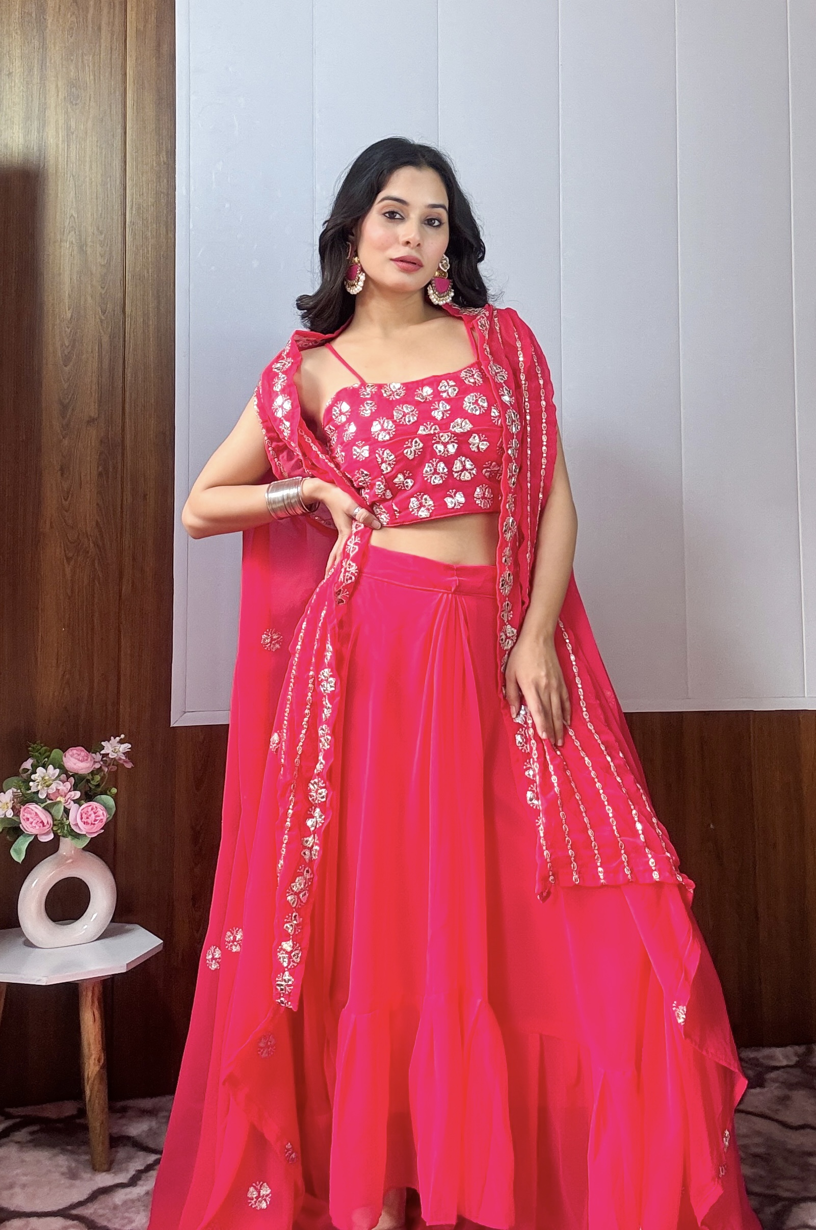 Pink color georgette fabric skirt lehengas have become a popular choice for many fashion enthusiasts. Renowned for their lightweight and flowing nature, georgette skirts elevate the elegant silhouette of traditional lehengas. This blend of comfort and style makes them suitable for various occasions, from weddings to festive gatherings.