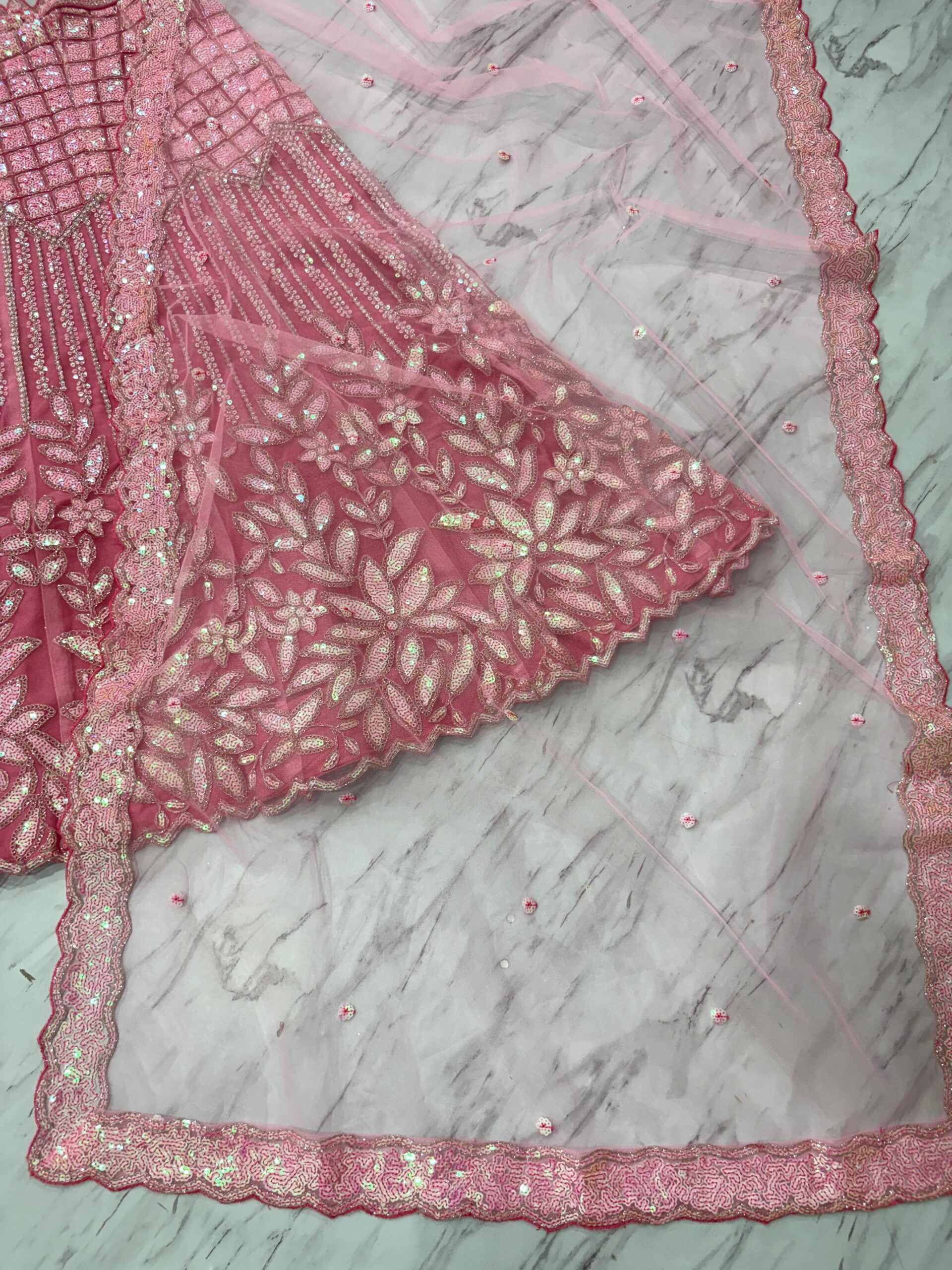 - Discover the elegance of the Pink color Net fabric lehenga, adorned with intricate sequence work. Ideal for weddings and festive celebrations, this lightweight and breathable garment drapes beautifully, ensuring comfort and style.