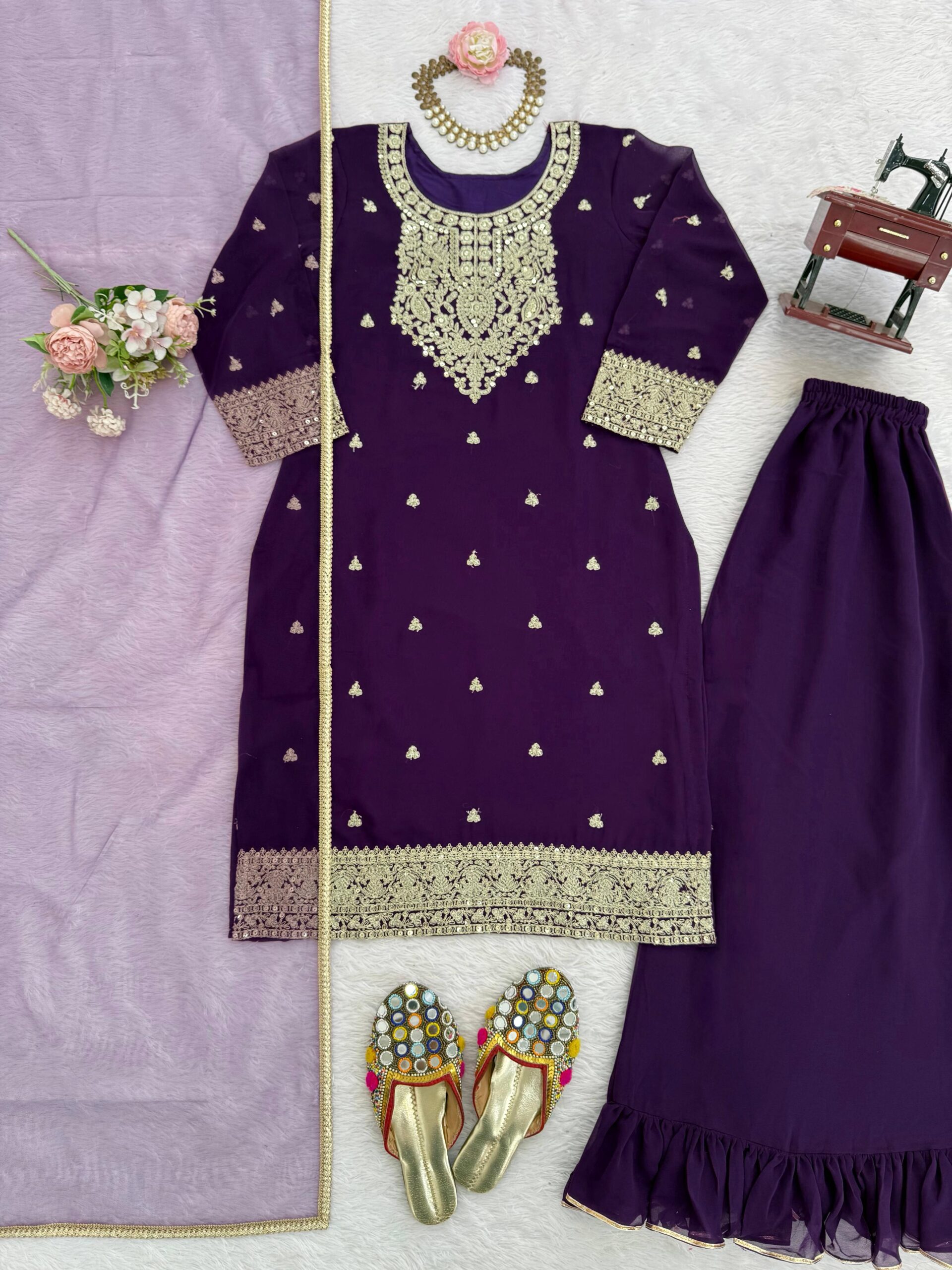 Whether you’re attending a wedding reception, a festive celebration, or a casual gathering, this ensemble is sure to make heads turn, particularly when featuring the renowned Purple Faux Georgette Palazzo Set.