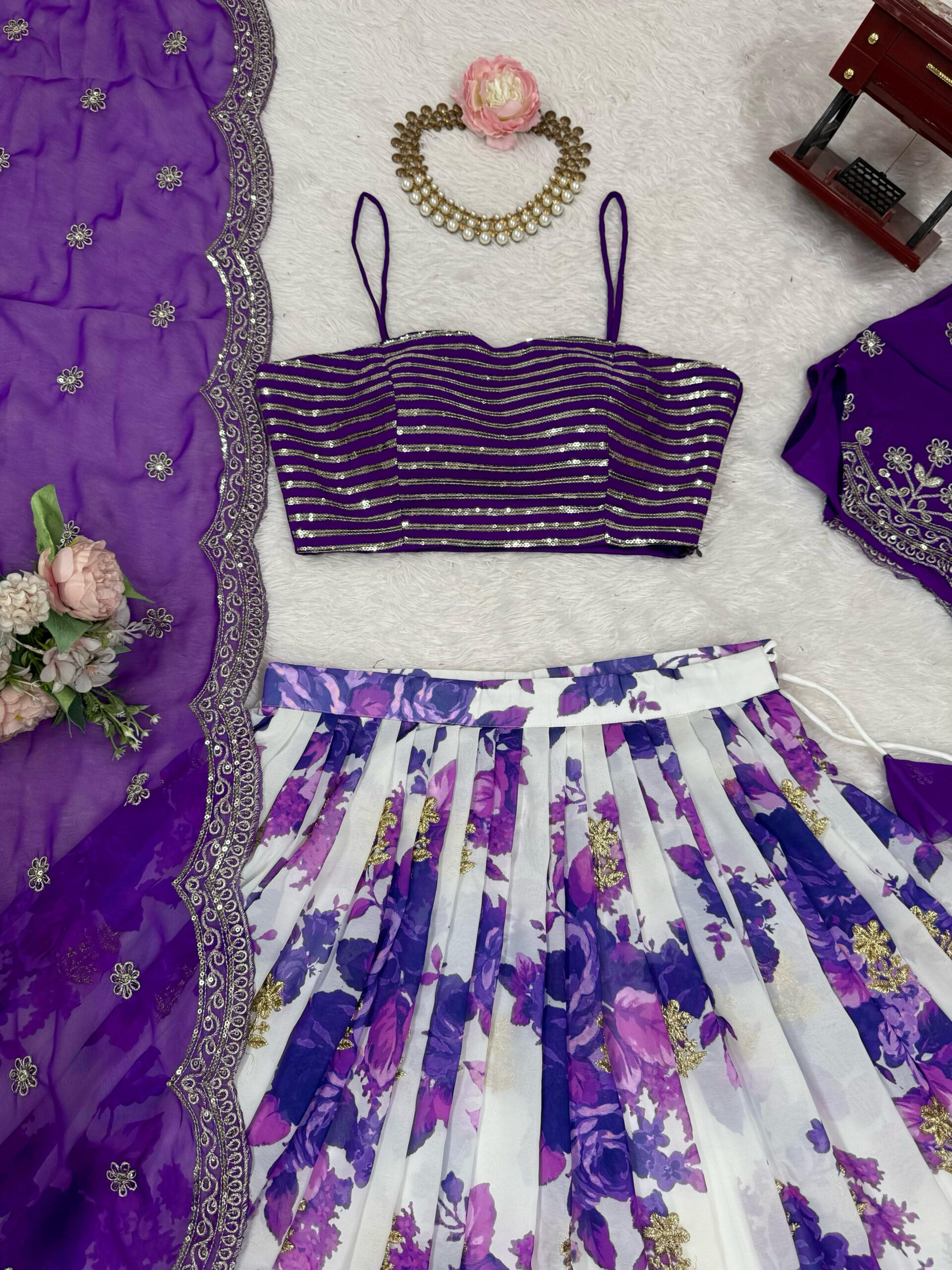 The allure of traditional attire is undeniable, especially when it comes to lehengas. Among the latest trends in ethnic wear, the Purple color faux georgette fabric lehenga stands out. This vibrant piece combines a classic silhouette with contemporary design elements, making it a must-have for festive occasions.