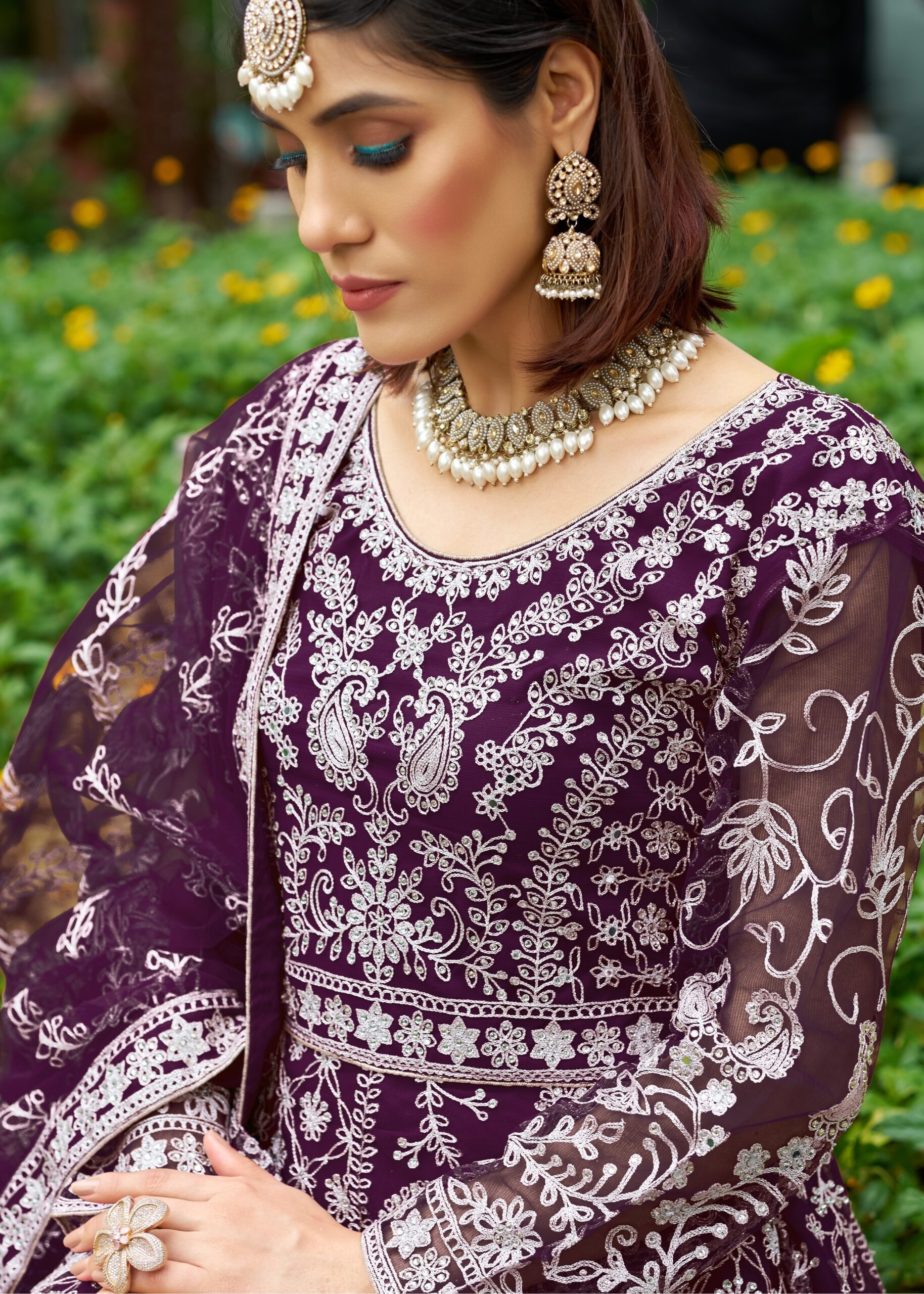 Heavy embroidery work on Purple color pure butterfly net fabric transforms simple outfits into opulent creations. The intricate designs often feature floral motifs, geometric patterns, or traditional embroidery techniques. These reflect rich cultural heritage, emphasized in a Purple Net Fabric Suit.