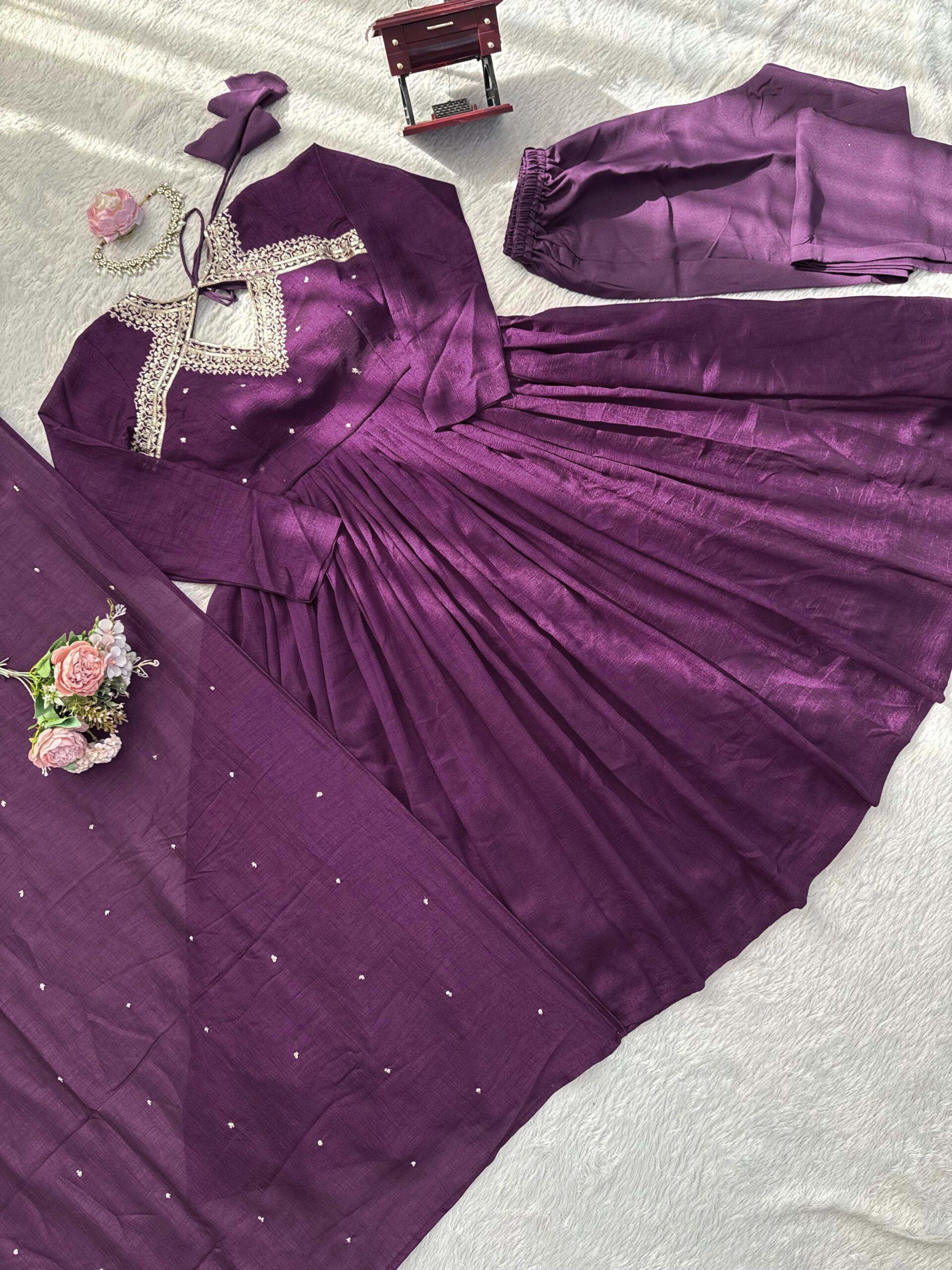 When it comes to styling a Women’s Ethnic Wear Purple Vichitra Silk Thread Work, the options are endless. Pair it with statement jewelry to bring out the richness of the fabric, or opt for minimal accessories to let the suit take center stage. Furthermore, try experimenting with a Suit to refresh your festive wardrobe.