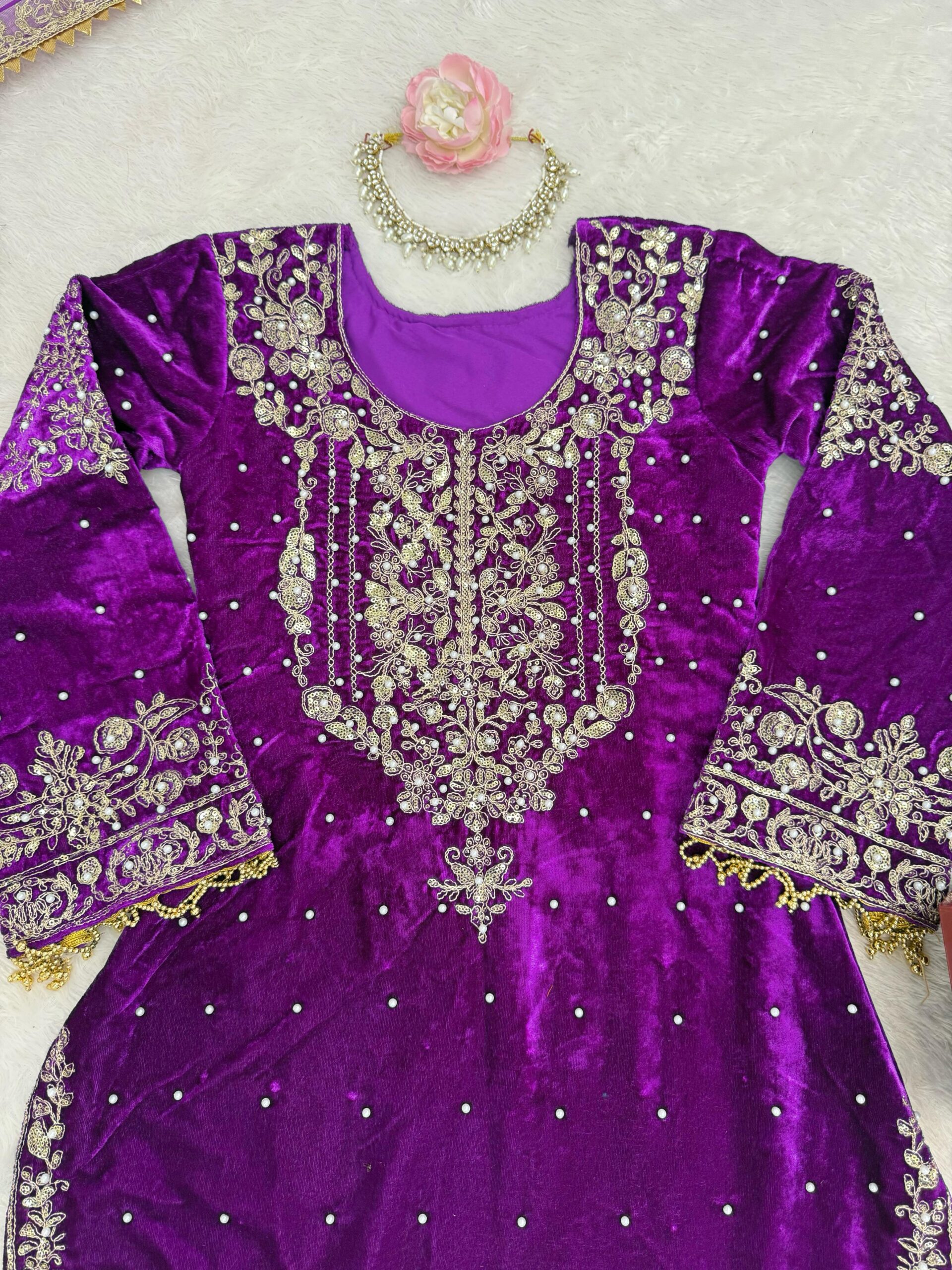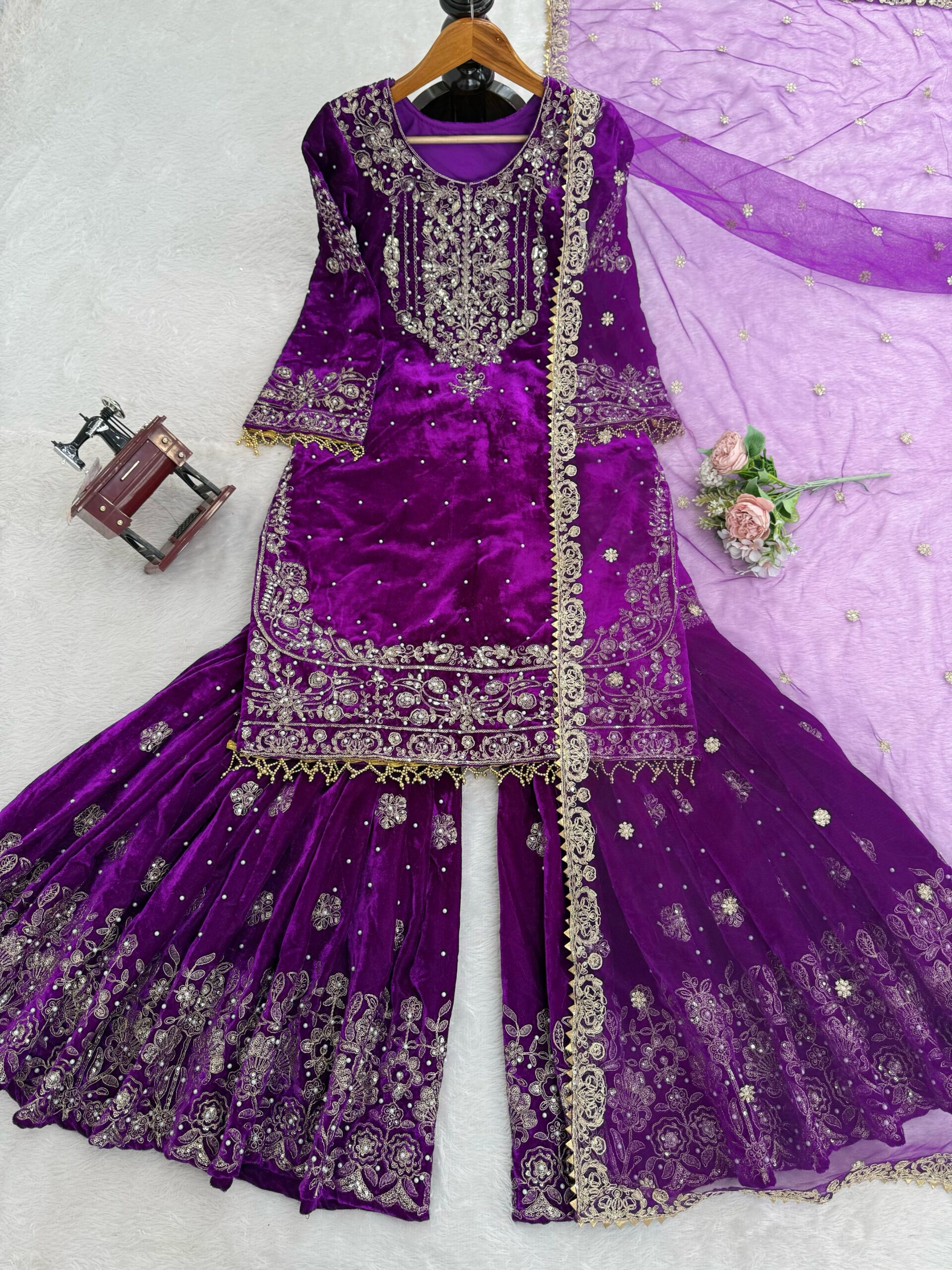 The Allure of Purple Color Viscose Velvet Fabric Sequence Work With Pearl Work Sharara Suit