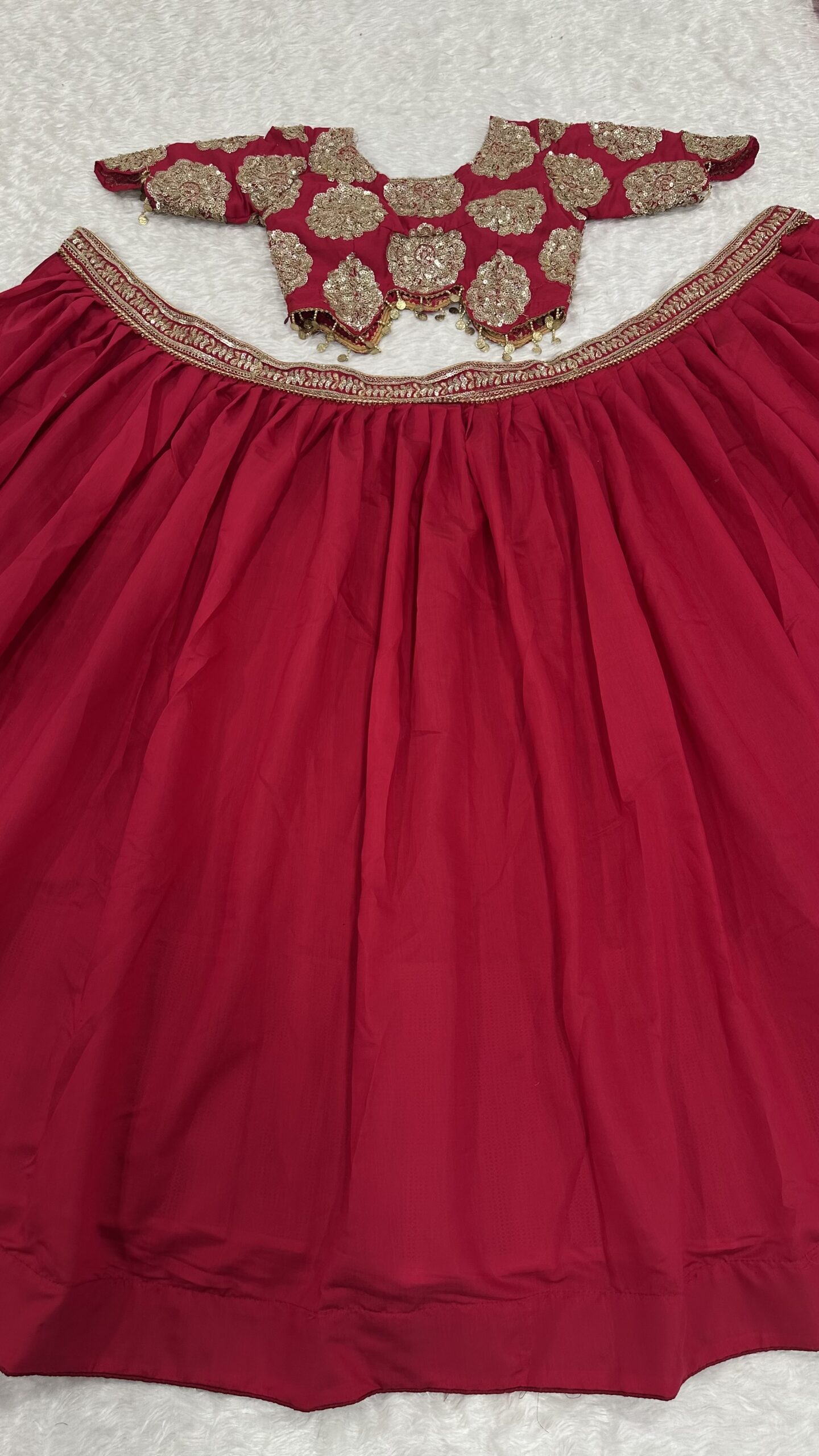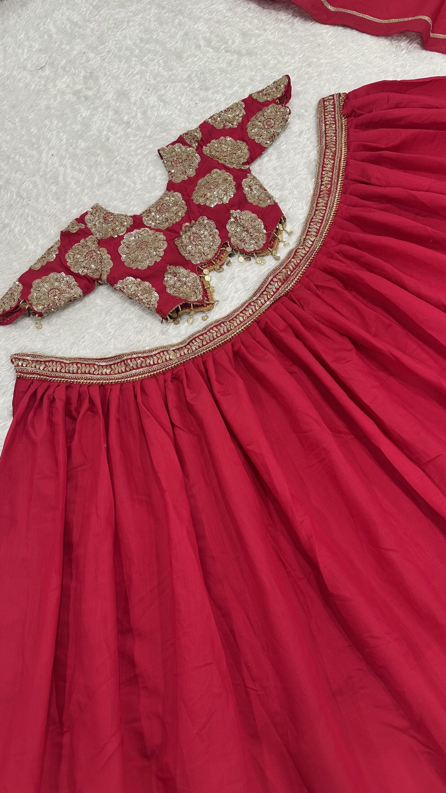 In summary, the Rani Pink color Roman Silk fabric Sequence With Dori Work lehenga is a timeless piece that brings together elegance and comfort. Its intricate design and beautiful fabric make it a perfect addition to any fashionista’s collection. Celebrate your next special occasion by embracing the beauty of this stunning lehenga.