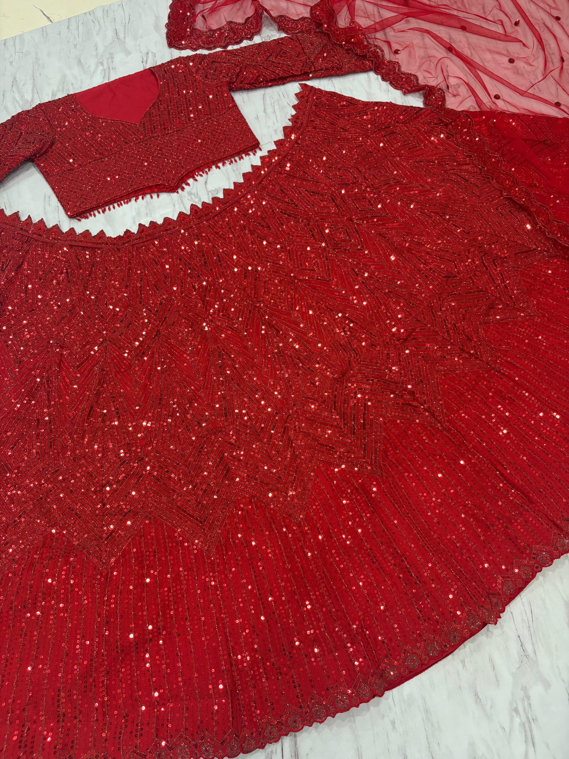 - Discover the elegance of Faux Georgette Fabric in the latest Red lehenga designs. This delicate and lightweight fabric, complemented by intricate Sequence Work, creates show-stopping pieces perfect for weddings and festive celebrations.