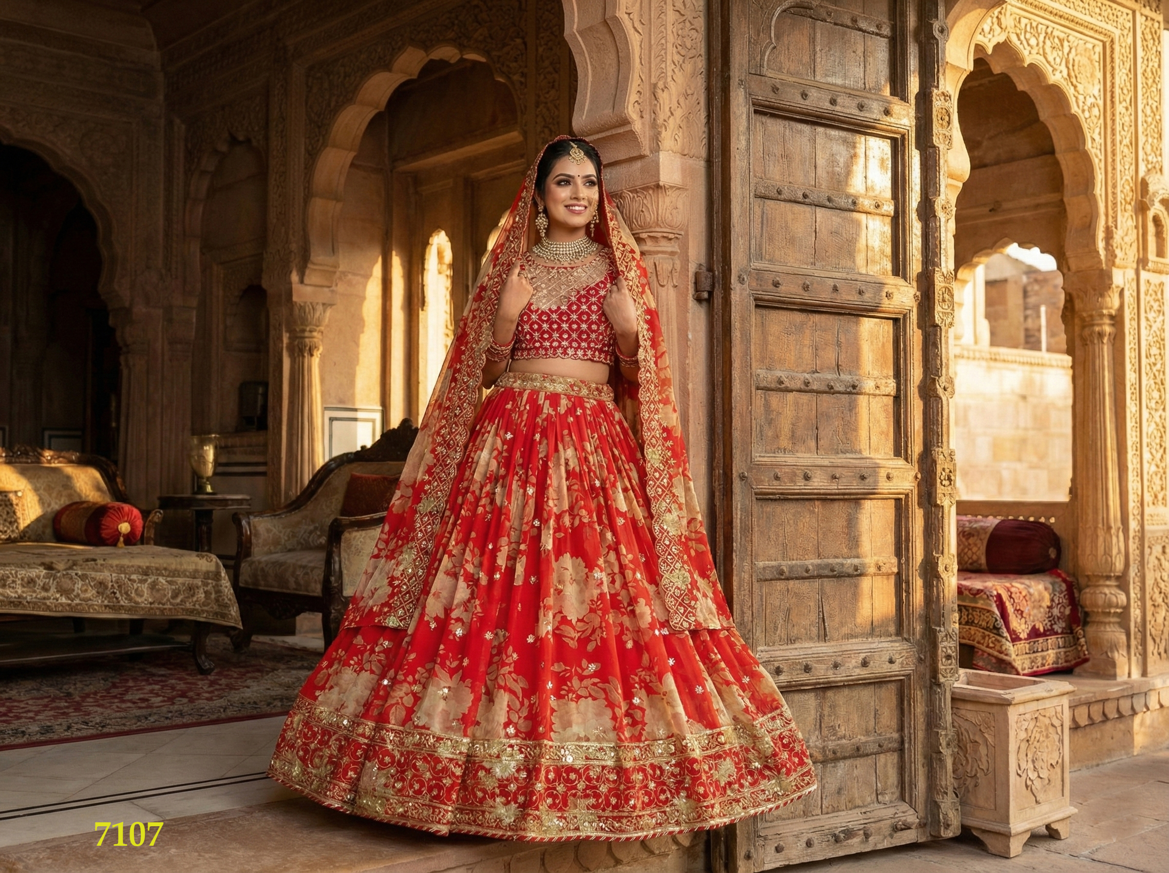 To complete the look of your Red Georgette lehenga, consider pairing it with delicate accessories. Opt for minimalist jewelry to let the lehenga’s floral print speak for itself. Soft curls or an elegant bun can elevate the look even more. Whether you’re attending a wedding or a festive celebration, this ensemble is sure to turn heads.