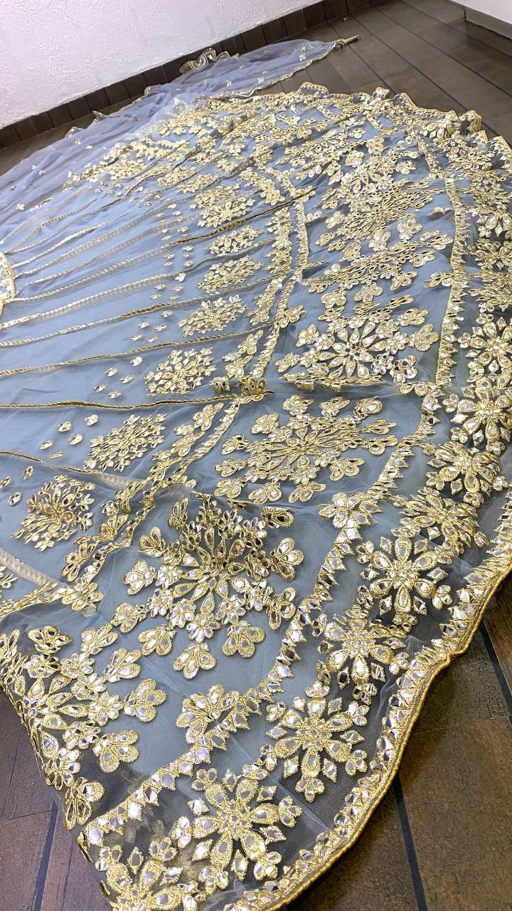 - Discover the elegance and sophistication of the Sky Blue Net Fabric lehenga, adorned with exquisite Foil Paper With Jari Work. Perfect for weddings, parties, or festive occasions, this lehenga seamlessly blends traditional craftsmanship with modern aesthetics.